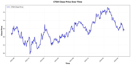 Stock trend forecasting is treated as a binary classification problem [44,45]. The objective is to predict the probability of upward or downward movement over the next F days, where F denotes the forecast horizon. Notably, our task focuses on trend classification (predicting relative price movements) rather than regression (predicting absolute price levels)—this guides our input processing to prioritize capturing relative temporal dynamics over modeling absolute price values directly. For each stock data sample , where , the label is defined as
