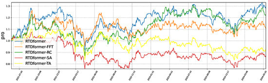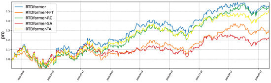 The ablation experiments confirm the necessity of each component in HRformer. The backtesting results of these ablation experiments are presented in Figure 13 and Figure 14, while the performance metrics of the ablation experiments are detailed in Table 6 and Table 7. Consistent with our theoretical claims: removing FFT decomposition (HRformer-FFT) or volatility branch (HRformer-VC) reduces F1-score/Sharpe ratio () (validating frequency-domain coverage), while removing ISCA (HRformer-ISCA) weakens cross-stock modeling (validating spatial coupling value)—aligning with mathematical and information-theoretic justifications, and replacing temporal attention with MLP (HRformer-TA) degrades long-range and periodic dependency capture.