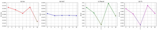 Impact of the number of attention heads on ACC, PRE, REC, and F1.