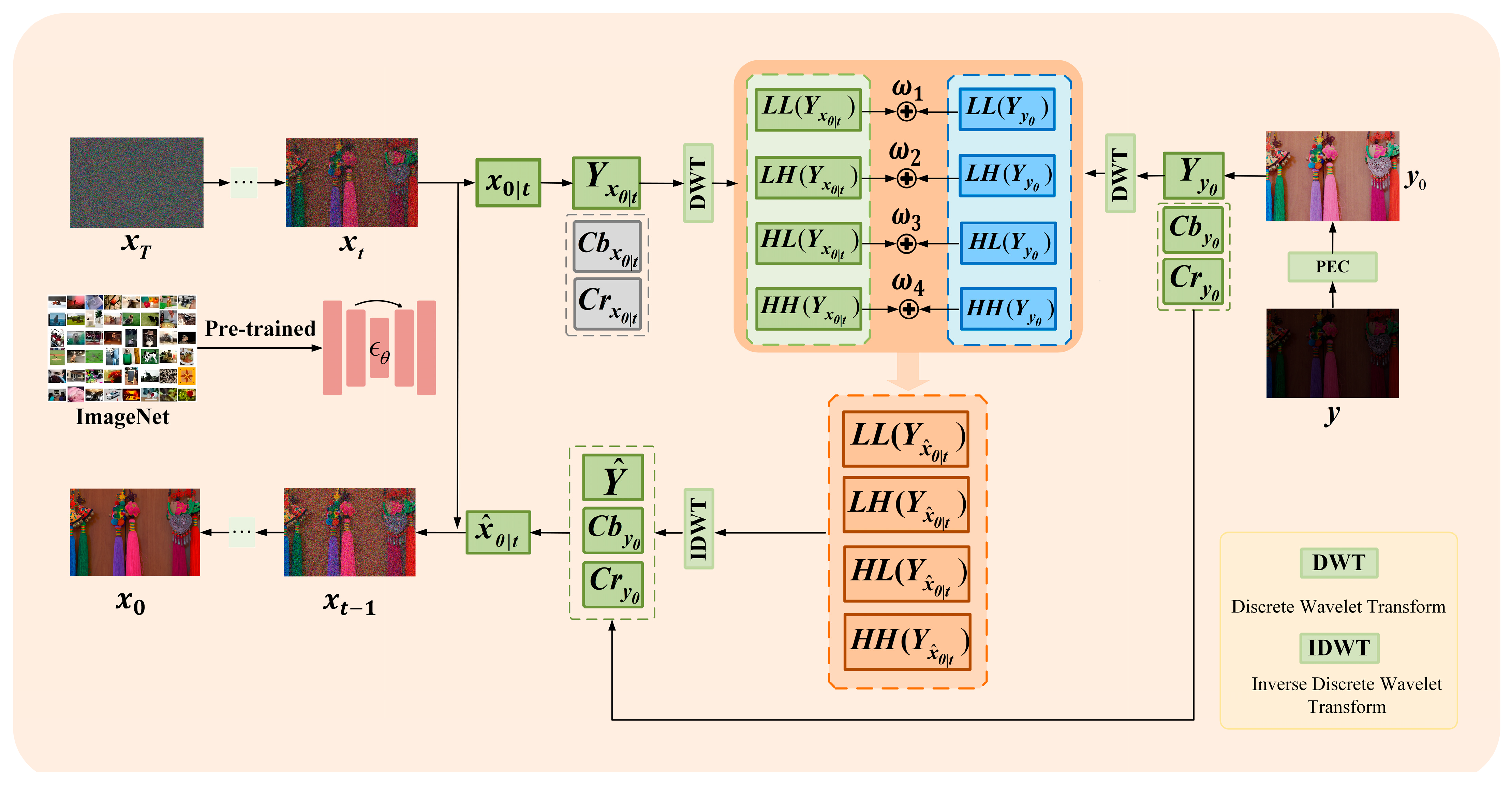 35] prior to diffusion sampling; (ii) the effectiveness of converting images from the RGB space to the YCbCr space for subsequent processing; (iii) the effectiveness of decomposing the images via DWT and subsequently fusing the corresponding sub-bands with learnable weights; (iv) the effectiveness of the two introduced loss functions (i.e.,
