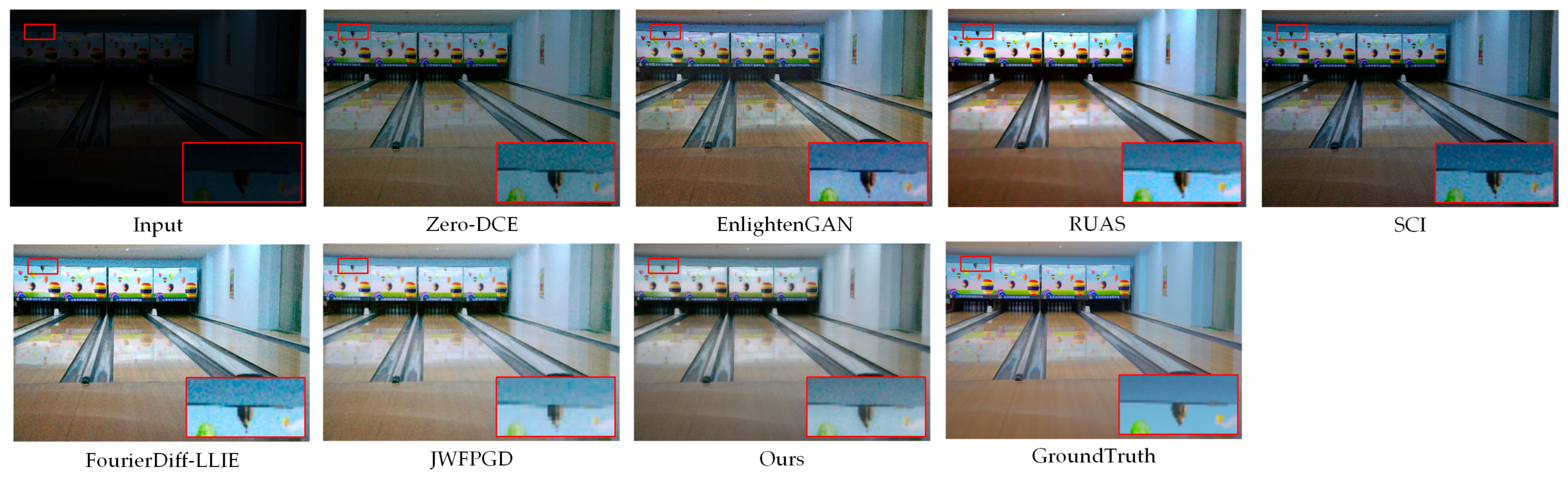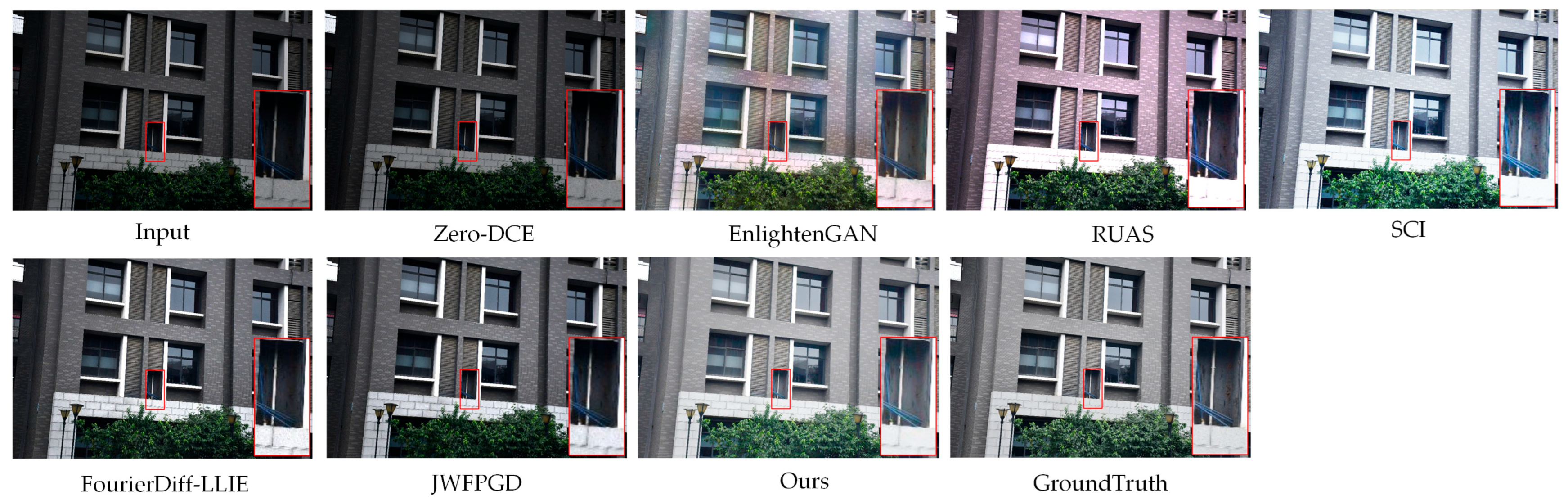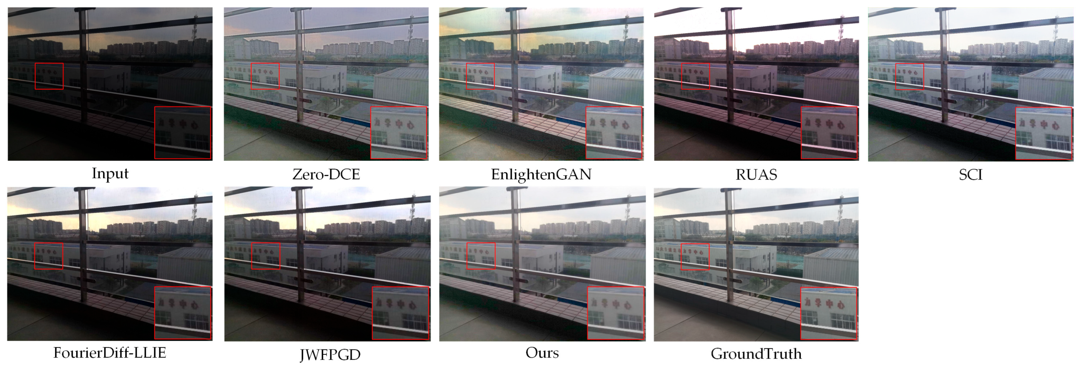 34] method can effectively restore the normal illumination level, it still exhibits significant deficiencies in detail restoration. Specifically, the object edges in the region of interest show obvious block artifacts. Our approach successfully restores natural illumination while preserving high perceptual quality, exhibiting superior spatial smoothness. In contrast to competing methods, it introduces virtually no visible noise or artifacts.