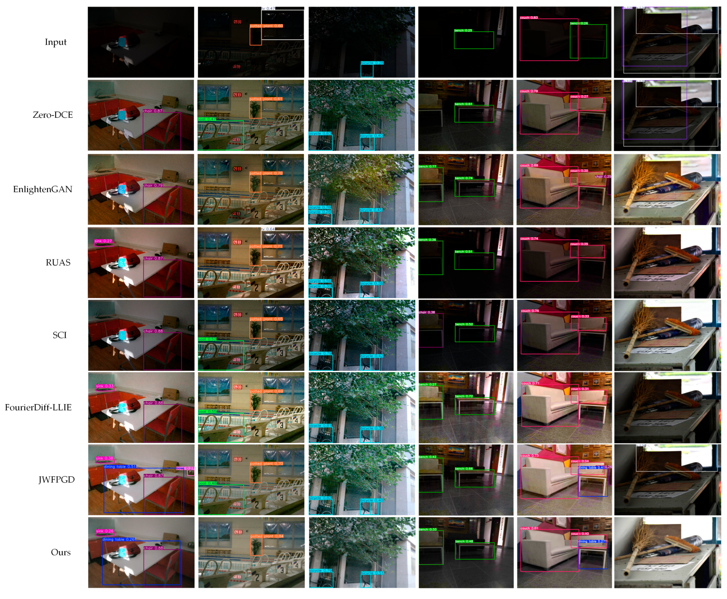 Figure 9. The first row presents the object detection results on the original low-light images, while the remaining rows show the object detection results on images processed by Zero-DCE [