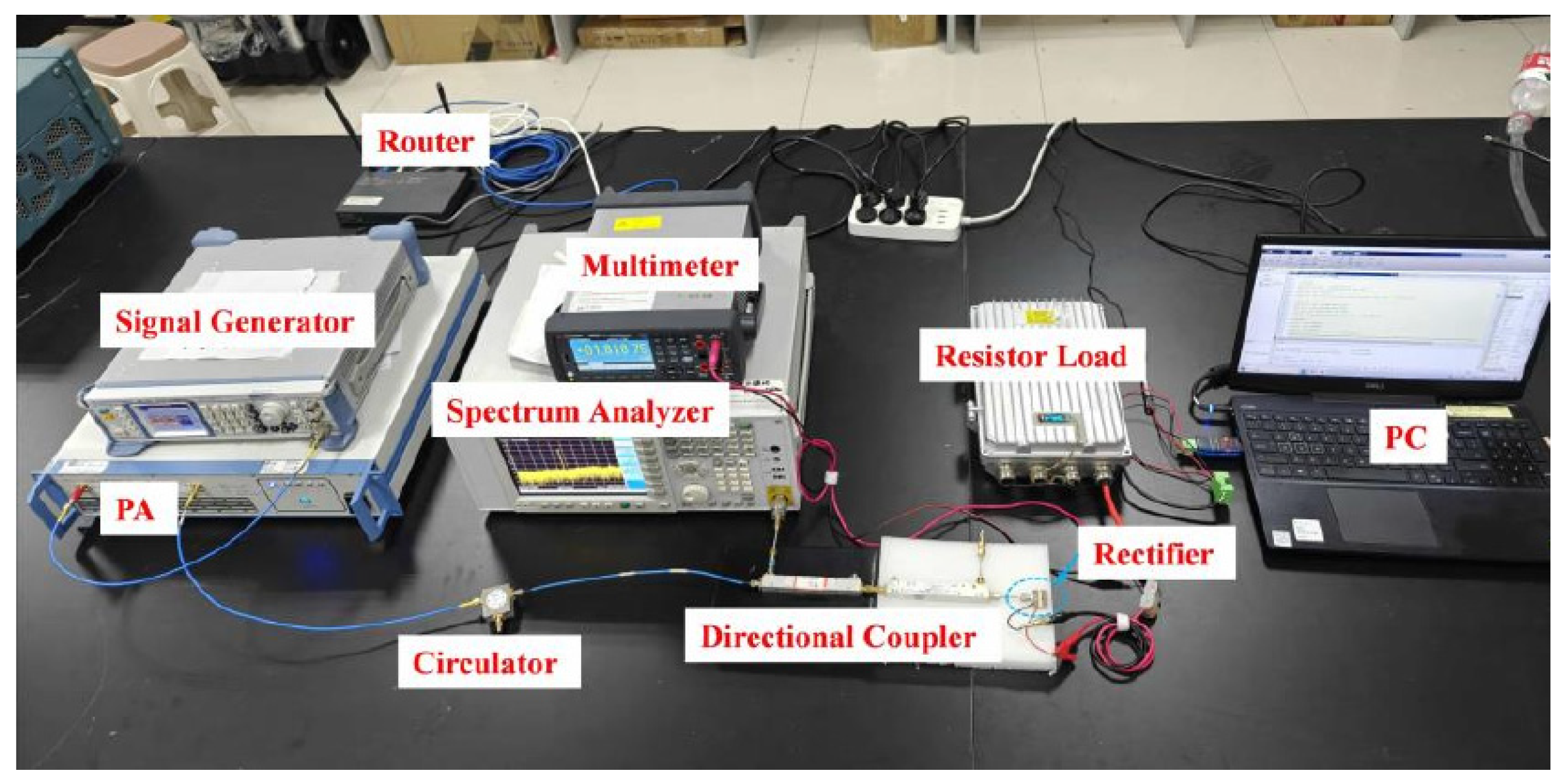 - Peng, J.; Wang, S.; Li, X.; Wang, K. A Novel 10-Watt-Level High-Power Microwave Rectifier with an Inverse Class-F Harmonic Network for Microwave Power Transmission. Electronics 2024, 13, 3705. [Google Scholar] [CrossRef]
