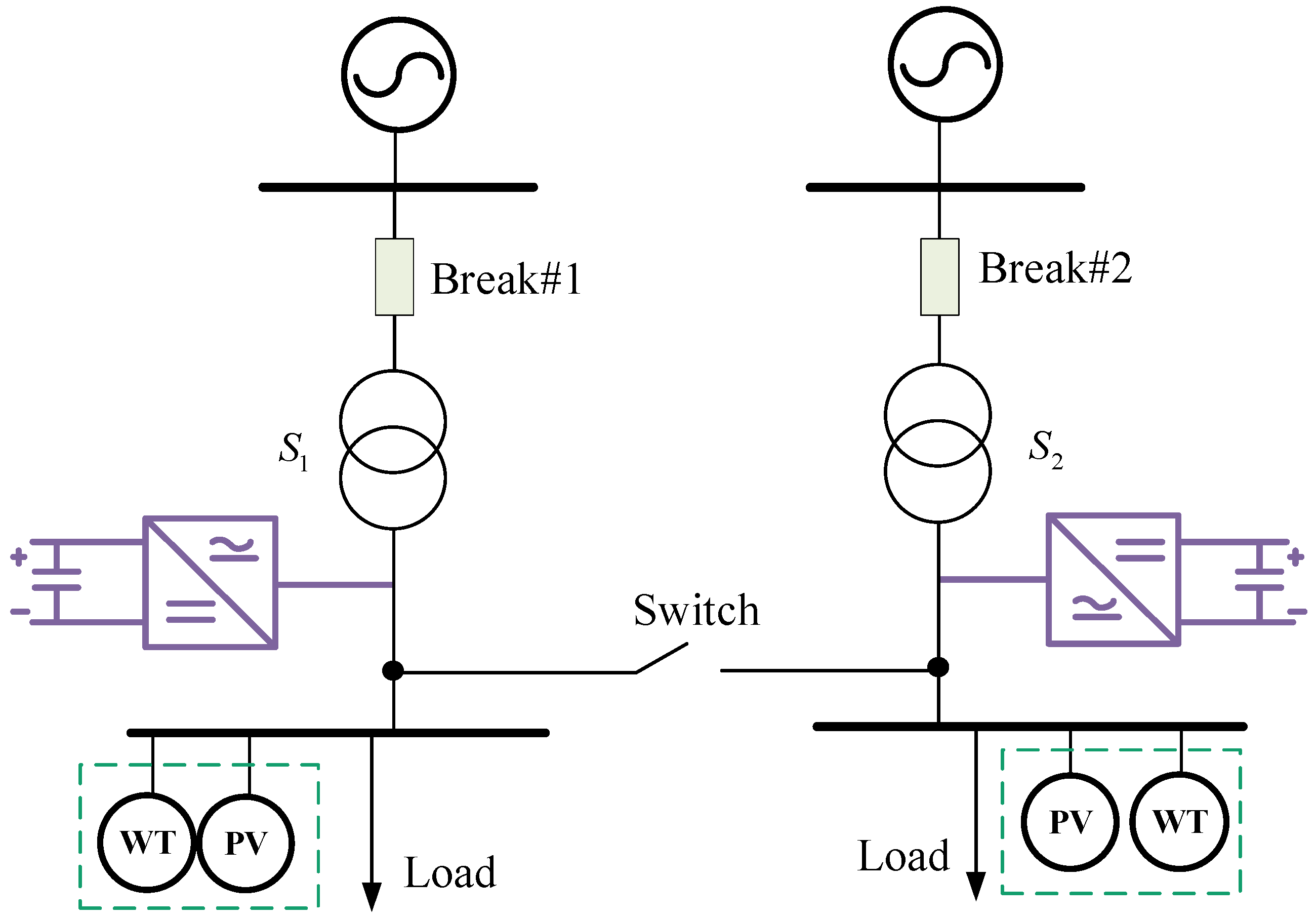 In the system shown in Figure 1, under normal operation, the mechanical switches are often open and do not operate in parallel. When a transformer or its superior power supply system fails, the circuit breaker can be disconnected to isolate the branch fault, and the bus coupling switch can be quickly closed to realize the load transfer. In addition, in order to improve the voltage and power quality at the bus, reactive power compensation devices may be configured, such as simple and inexpensive devices such as capacitor compensation or static synchronous compensator (STATCOM) of high-power power electronic devices with stronger control ability and higher cost.