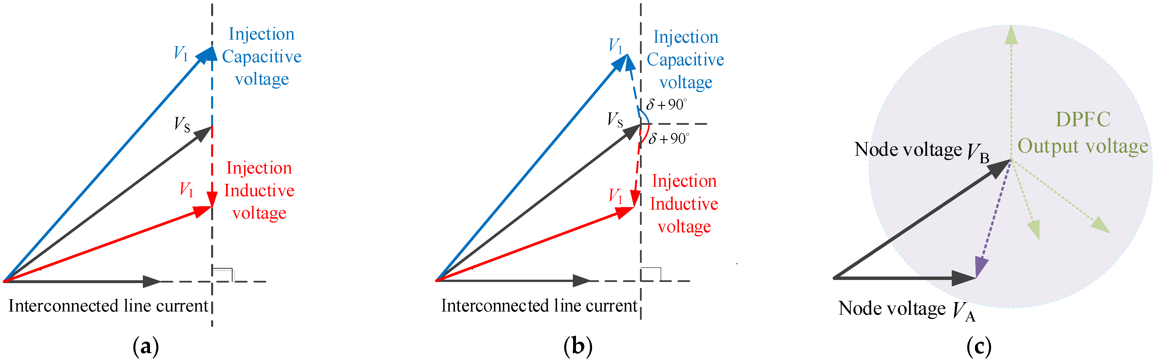 The distributed power flow controller can output the equivalent voltage with controllable amplitude and phase angle perpendicular to the line current, or the equivalent resistance or equivalent capacitance with controllable impedance, thereby changing the voltage or impedance parameters of the receiving end of the line, and then regulating the active power flow or reactive power flow of the line. The working phasor diagram is shown in Figure 3a. However, due to the active loss caused by non-ideal components in actual operation, the phase angle difference between the actual output voltage and the line current will be slightly larger than 90°, and the working phasor diagram is shown in Figure 3b. The active power deviation caused by the additional phase shift remains within 1.2%, and the reactive power error is below 2.0%, which is acceptable for engineering application. The distributed power flow controller can be equivalent to an equivalent voltage source with controllable output amplitude and phase angle. It is equivalent to a variable impedance from the impedance characteristics. It can not only adjust the active and reactive power flow of the interconnected line, but also be used to compensate for the voltage amplitude difference and phase angle difference between the interconnected nodes, as shown in Figure 3c. In the figure, V ˙ S is the bus voltage at the beginning of the line. V ˙ I is the terminal voltage of the line after the equivalent voltage is injected into the DPFC. V ˙ A and V ˙ B are the voltage of the interconnection node, respectively.