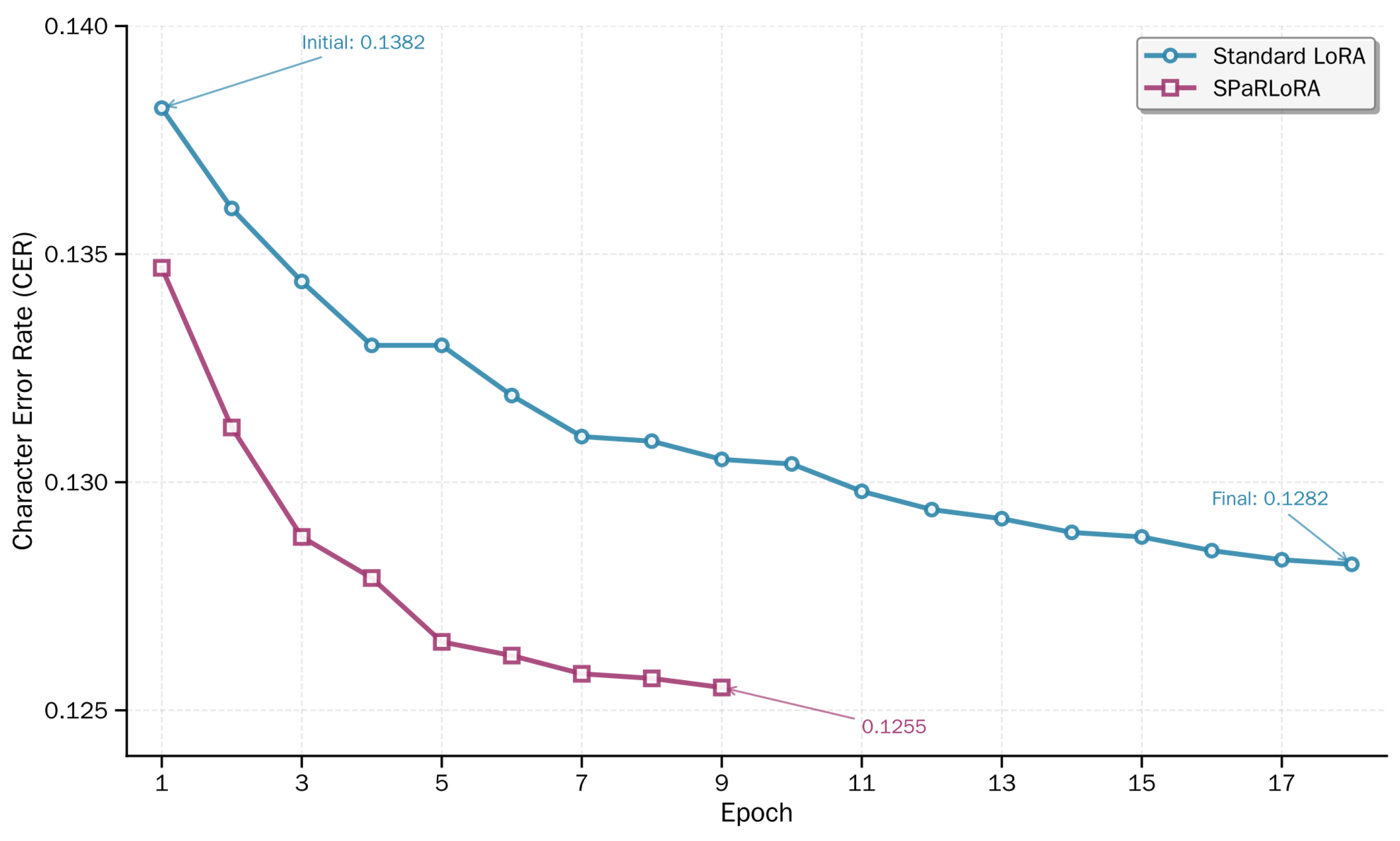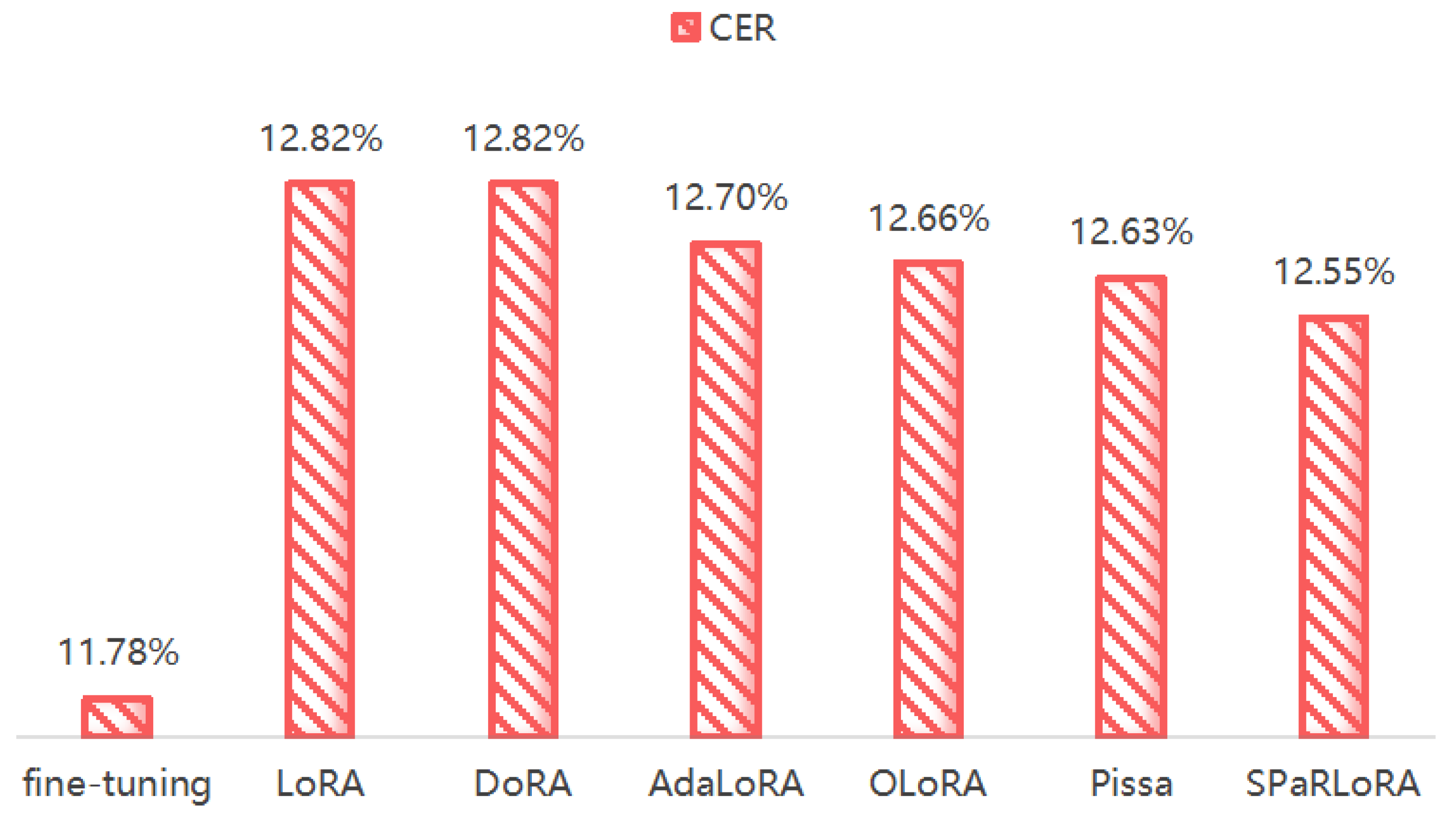 Figure 5 summarizes the performance of SPaRLoRA against baseline methods on the Sichuan dialect test set. SPaRLoRA achieves 12.55% CER, outperforming standard LoRA (12.82%) by a relative 2.1% and converging approximately 30% faster. It also surpasses DoRA, AdaLoRA, and PiSSA while introducing