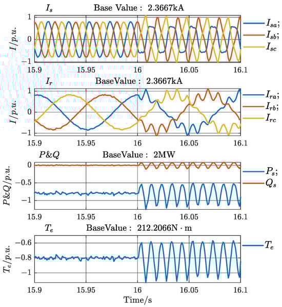 In Figure 3, the system operates under a balanced grid condition before 16 s. At 16 s, a sudden voltage sag in phase B of the power supply is introduced, plunging the system into an unbalanced grid condition. Under the unbalanced grid, the rotor current is affected. It contains the fundamental component at the slip frequency sf1. It also contains harmonic components at the frequency of |−(ω1 + ωr)f1/ω1|. These harmonic components manifest as twice the fundamental frequency (100 Hz for a 50 Hz system) alternating quantities in the dq+ reference frame rotating at the positive synchronous speed ω1. Grid voltage imbalance induces unbalance in the DFIG stator currents. This leads to second-order harmonic fluctuations (twice the fundamental frequency). These fluctuations appear in the active/reactive power and electromagnetic torque. Simultaneously, it jeopardizes the stability of the DC bus voltage, therefore having significant adverse impacts on the overall stability and safety operation of the system.