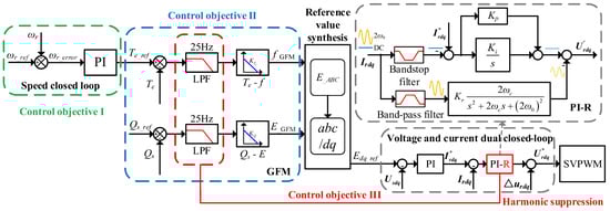 Finally, for unbalanced-grid scenarios, Control Objective 3 is presented: suppression of harmonic components introduced by grid unbalance. The strategy comprises two parts. The first measure is phenomenological: it directly address the twice-fundamental harmonic components in power and electromagnetic torque. In the grid-forming control, filters are introduced to remove the twice-fundamental components from the electromagnetic torque reference, as well as from the feedback signals of electromagnetic torque and reactive power.