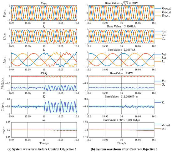 The waveforms of DFIG-GESS PCC voltage, stator, and rotor currents, stator electromagnetic power, and electromagnetic torque under the unit value are shown in Figure 11. The second-order harmonic fluctuations at twice the fundamental frequency of the rotor current in the dq+ coordinate system in the figure is effectively suppressed. The stator and rotor currents in the abc three-phase static coordinate system are closer to sinusoidal with less distortion. Figure 12 shows the THD analysis of the rotor current, and the harmonic (90 Hz, 110 Hz) of the rotor current is effectively suppressed under the Control Objective 3. Comparing Figure 12a,b, it can be seen that the machine network coordinated control including Control Objective 3 can effectively suppress the negative sequence component of the stator and rotor current, which reduces the rotor current THD from 12.57% to 1.71%, so as to suppress the second-order harmonic fluctuations at twice the fundamental frequency of the stator electromagnetic power and torque.
