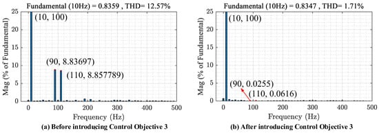 We set the second unbalanced scenario: at t = 16 s, the voltage sags to 0.9 p.u., while phase-A is raised to 1.1 p.u. The waveforms of DFIG-GESS PCC voltage, stator, and rotor currents, stator electromagnetic power, and electromagnetic torque under the unit value are shown in Figure 15. And Figure 16 shows the THD analysis of rotor current, and the harmonic (90 Hz, 110 Hz) of rotor current is effectively suppressed under the Control Objective 3, which reduces the rotor current THD from 22.75% to 1.78%.
