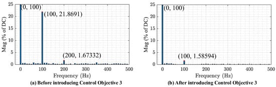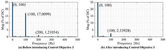 The results of FFT analyses of the stator electromagnetic power Ps and the electromagnetic torque Te are shown in Figure 13 and Figure 14. Under the baseline PI controller, the 2ω0 component in Ps accounts for 21.869% of the DC component, and the 2ω0 component in Te accounts for 17.01%. After introducing Control Objective 3, the 2ω0 components are effectively suppressed, decreasing from 21.869% to 1.586% in Ps and from 17.01% to 2.339% in Te.