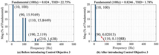 The THD analysis results for ira when the voltage of phase B dropped by 10%. (a) before introducing Control Objective 3, (b) after introducing Control Objective 3.