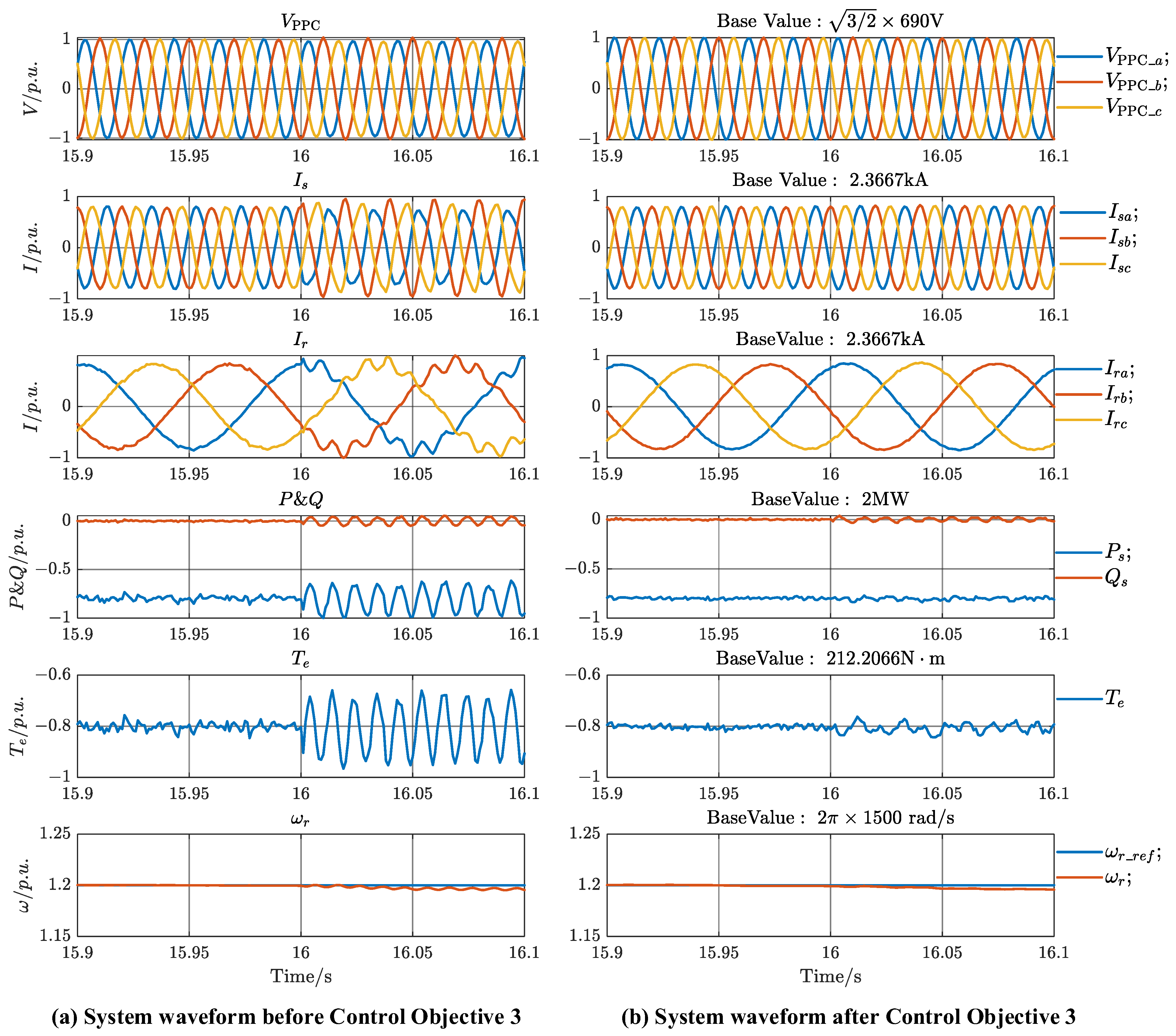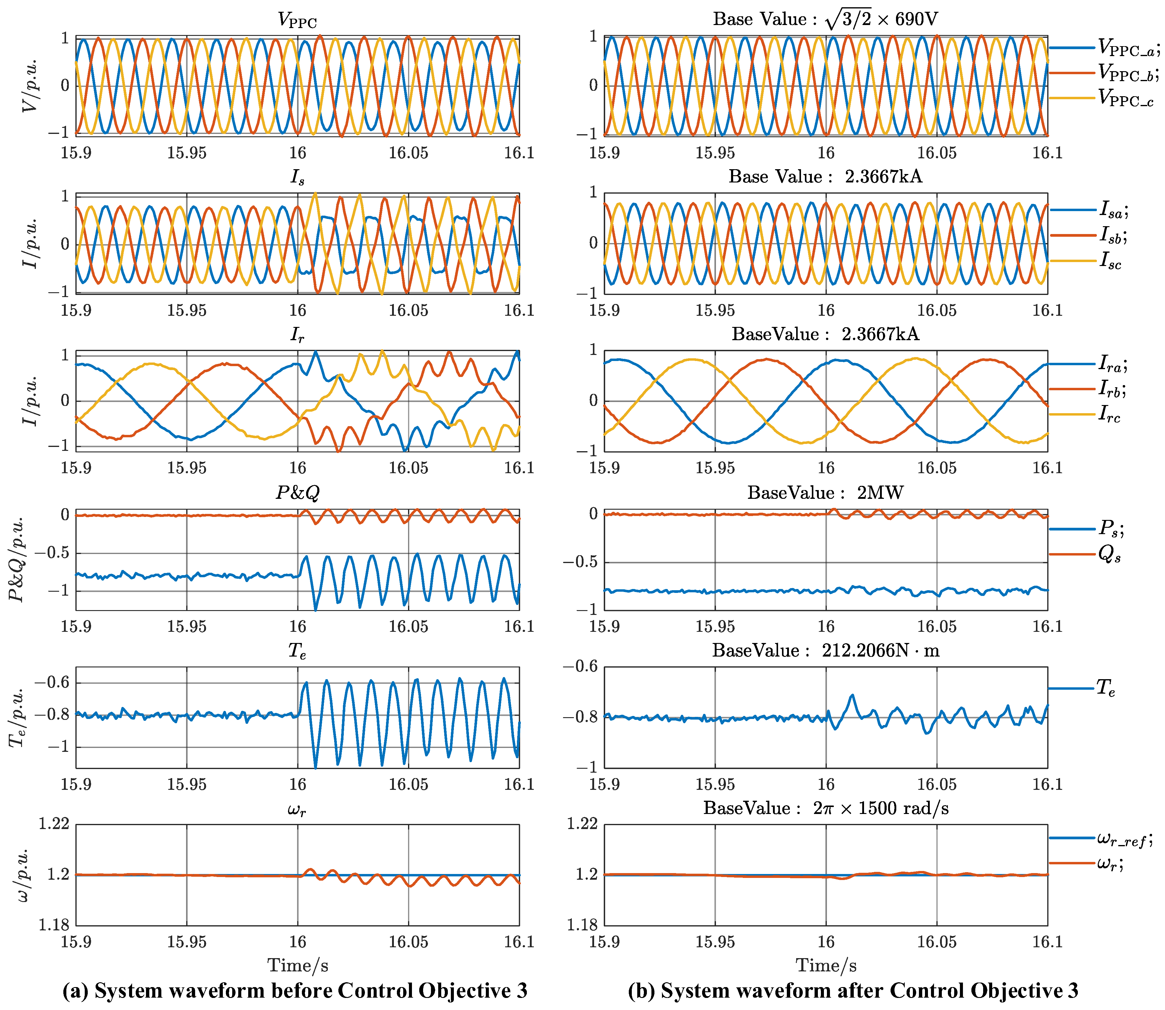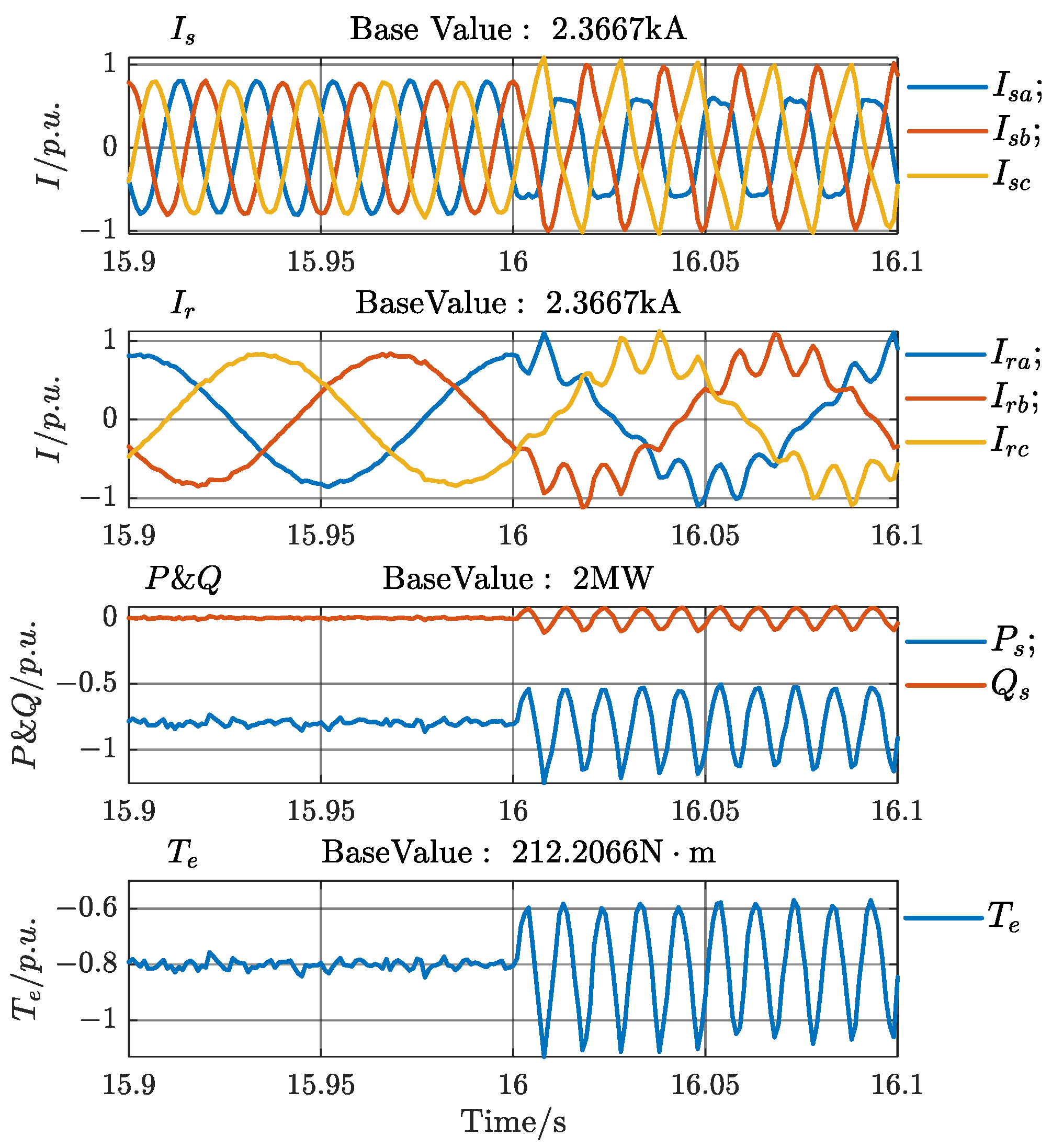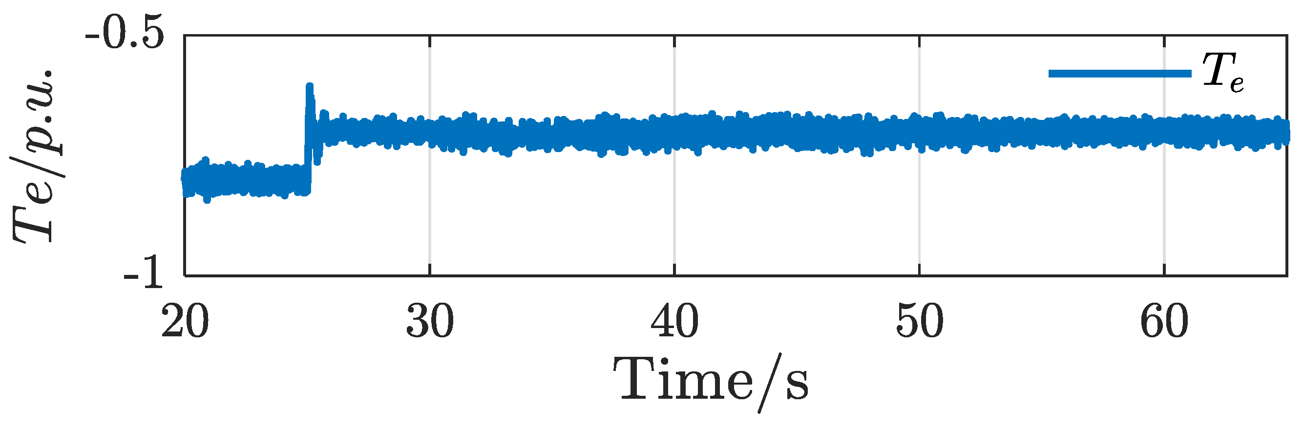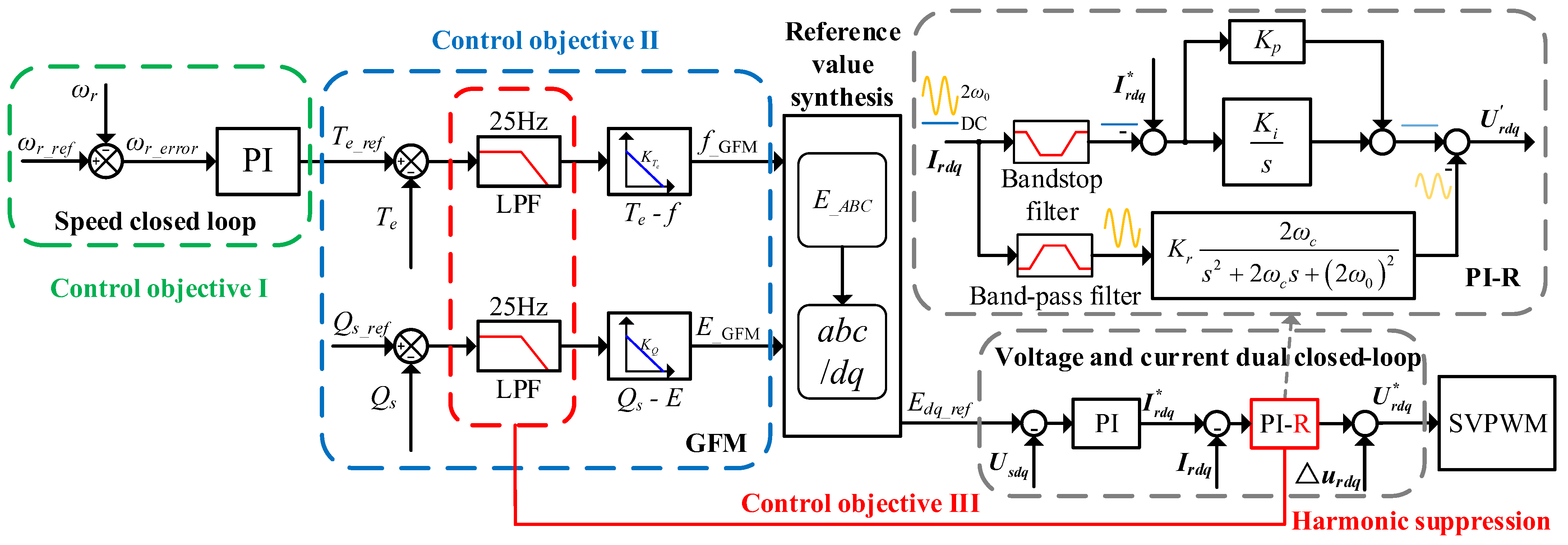 | Negative-sequence (−) | Produces a counter-rotating field; induces 2ω0 torque and current oscillations and elevates thermal stress; and directly motivates the PI–R current controller and the 2ω filtering in Te–f and Q–V droop paths |