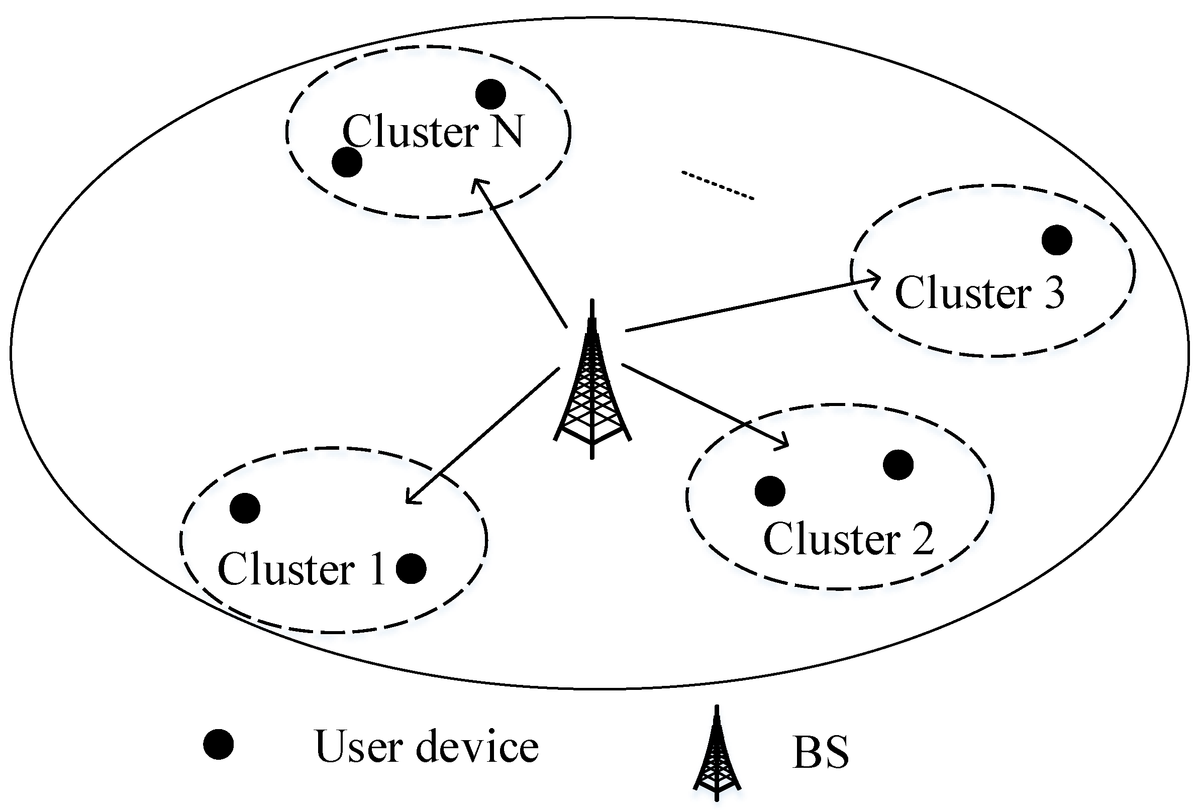 Consider the downlink system consisting of M users and 1 base station (BS) in Figure 1. M user devices are divided into N clusters. Notice that users and the BS can be considered sensor devices and control nodes or other equipment, respectively. Here we adopt a general description (user, BS, etc.) to introduce the system structure. It is worth noting that since the energy and efficiency performance of user equipment in downlink is much weaker than that of the BS, the number of users in one cluster needs to be further limited [20]. In addition, users are usually grouped pairwise to ensure decoding complexity in the NCMA system [21]. Thus, we adopt the same configuration. Each cluster contains two or one user (in general, two users per group is the recommended configuration, but when the number of users is odd, one user will be grouped separately), while each device only can be in one cluster. Thus, N = M 2 , where is the ceil operator. We assume that the total power budget of the BS is P T , and the power among clusters is equal. Consequently, the power of cluster i satisfies i = 1 N P i = P T . Additionally, frequency blocks are orthogonally occupied by clusters. Therefore, the impact among clusters is negligible and conventional NCMA (or the proposed PD-NCMA) method can be adopted in any cluster.