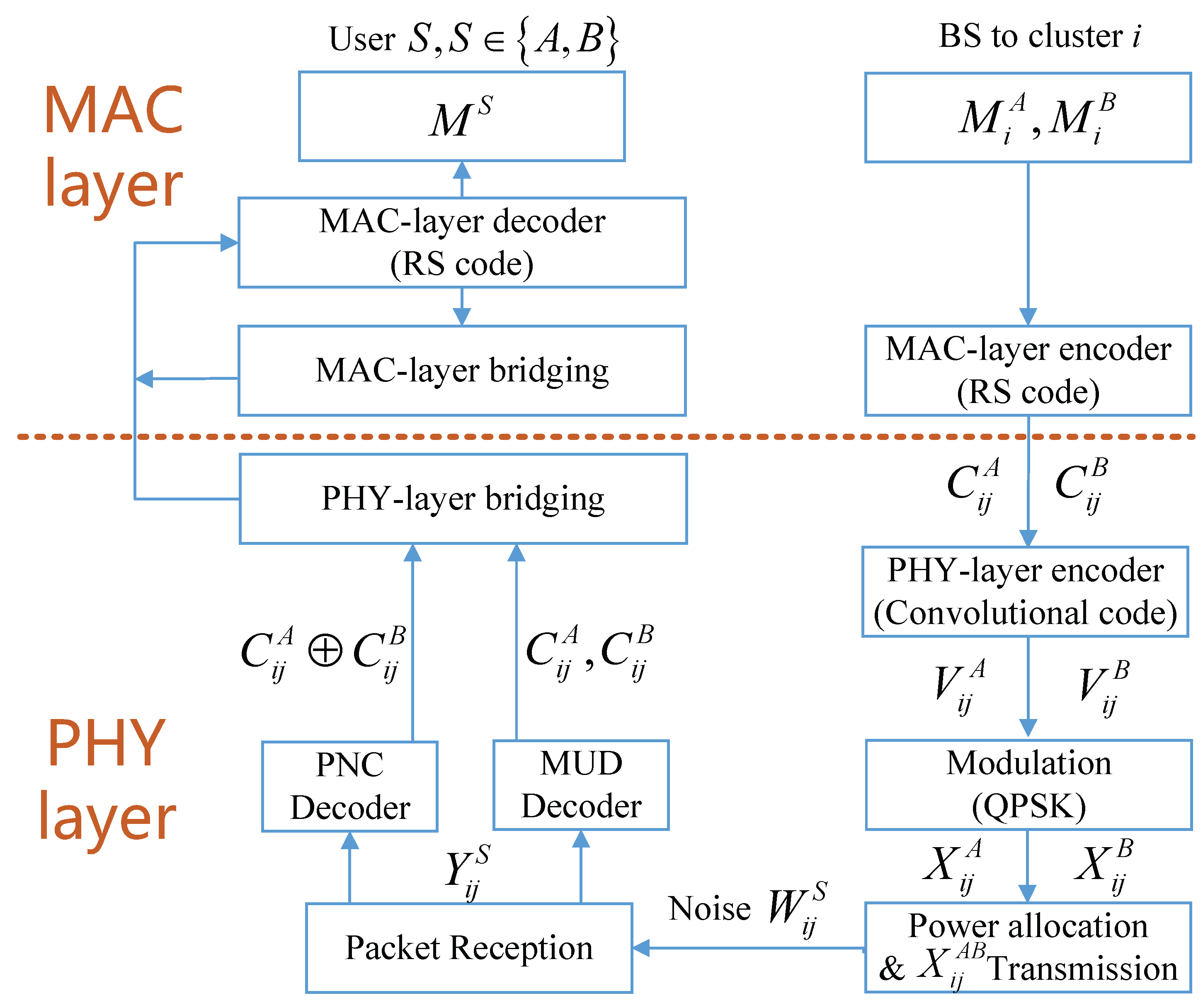 Notice that G represents the invertible generator matrix [22] for the RS code, and C i s is the set of multiple packets C i j s . C i j s further channel-coded into V i j s and modulated into X i j s at the PHY layer. Both user devices utilize the same modulation order, and the same convolutional code is adopted as for the PHY layer channel codes. Unlike PB-NCMA and PR-NCMA, the proposed PD-NCMA allocates varying power to the underlying signals X i j s of two users without channel information (Dynamic clustering and power allocation will be further discussed in Section 3). The power assigned to user s in cluster i is denoted by P i s , and the superposed signal of { X i j A , X i j B } can be expressed as