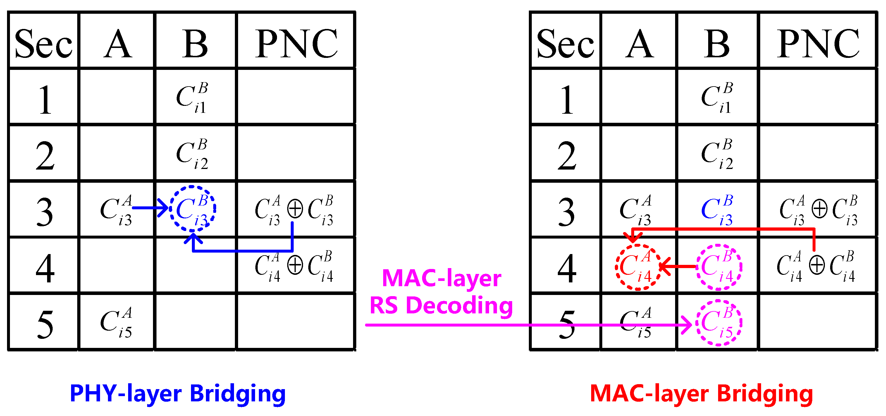 where H i j s is the downlink channel gain from the BS to user s, and W i j s is complex Gaussian noise. Both MUD and PNC detectors are equipped at the PHY layer to decode C i j A , C i j B , and C i j A C i j B . Notice that C i j A C i j B is the bit-wise exclusive OR (XOR) of C i j A and C i j B . A detailed derivation of the PNC and MUD detectors was introduced in [15]. After the bridging operation and MAC layer RS decoding of { C i j A C i j B , C i j A , C i j B } , each user can recover the original large message M i s after receiving enough C i j s . We focus on an example to explain the bridging operation. Figure 3 demonstrates the decoding outcomes in 5 continuous parts. In the third section, C i 3 A and C i 3 A C i 3 B are decoded by the MUD detector and PNC detector, respectively. Hence, PHY layer bridging [9], which utilizes the complementary XOR packet C i 3 A C i 3 B and C i 3 A , can be applied to recover C i 3 B . Since an L = 3 RS code is considered in the MAC layer to encode the original message into multiple packets, users need only L = 3 packets to recover the message. As a result, user B can recover M i B completely. This operation also means that the native packets C i 4 B and C i 5 B can be decoded synchronously based on re-encoding the recovered MAC layer message M i B , whereupon the original lone PNC packet C i 4 A C i 4 B can be utilized to recover C i 4 A with C i 4 B . This operation is known as MAC layer bridging [9]. As a result, user A now possesses enough native packets C i j A , j = 3 , 4 , 5 , to recover M i A .