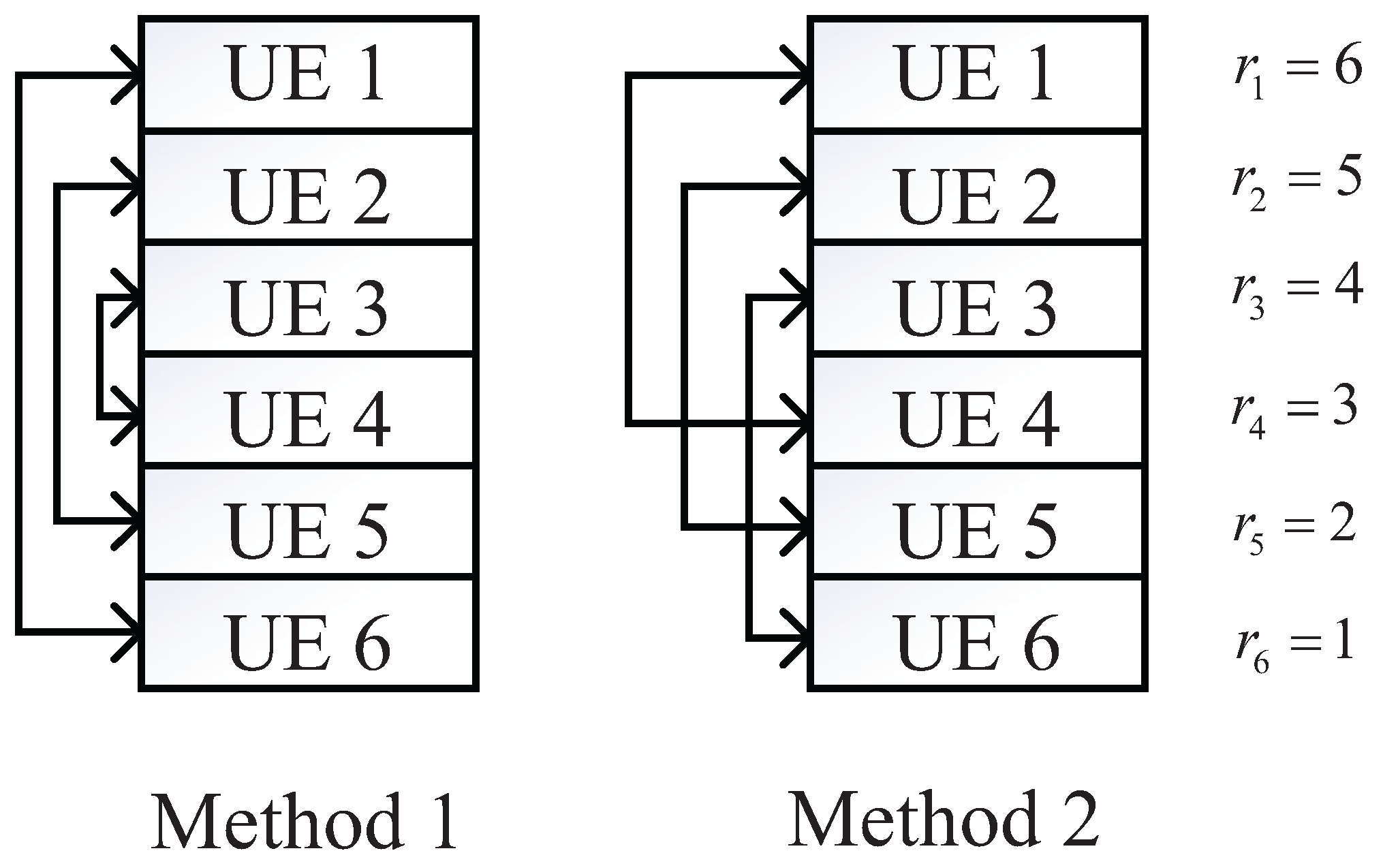 • Method 1: User device with message priority r m forms a cluster with r M m + 1 , m = 1 , 2 , , M . (i.e., the user device with the highest message priority r 1 forms a cluster with the lowest one r M ). If M is an even number, user devices are clustered pairwise. Nevertheless, a device with the priority r M + 1 2 forms a single-user cluster if M is an odd number.