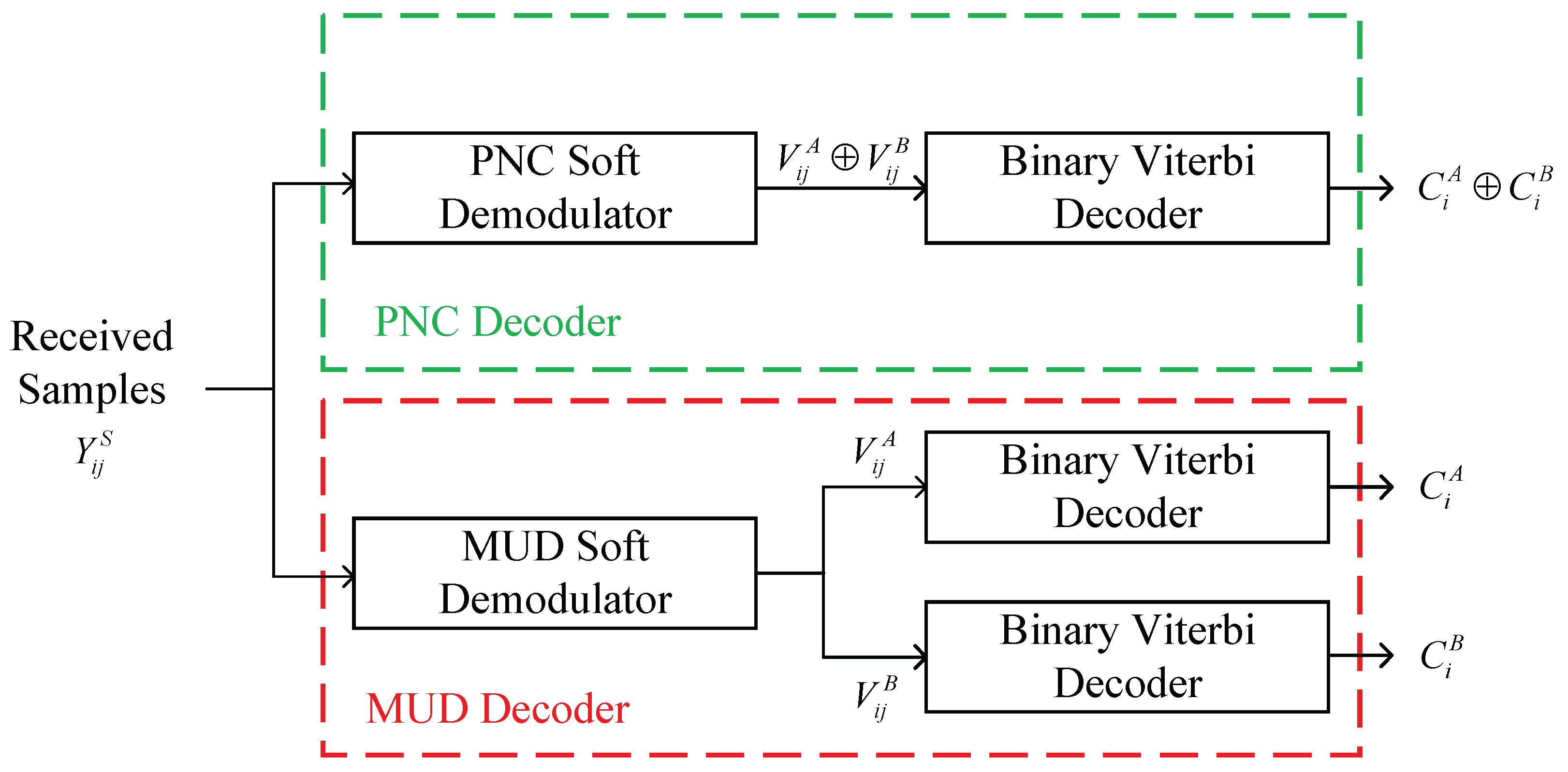 As depicted in Figure 5, the received signal is fed into PNC and MUD decoders simultaneously to decode C i j A , C i j B and C i j A C i j B .