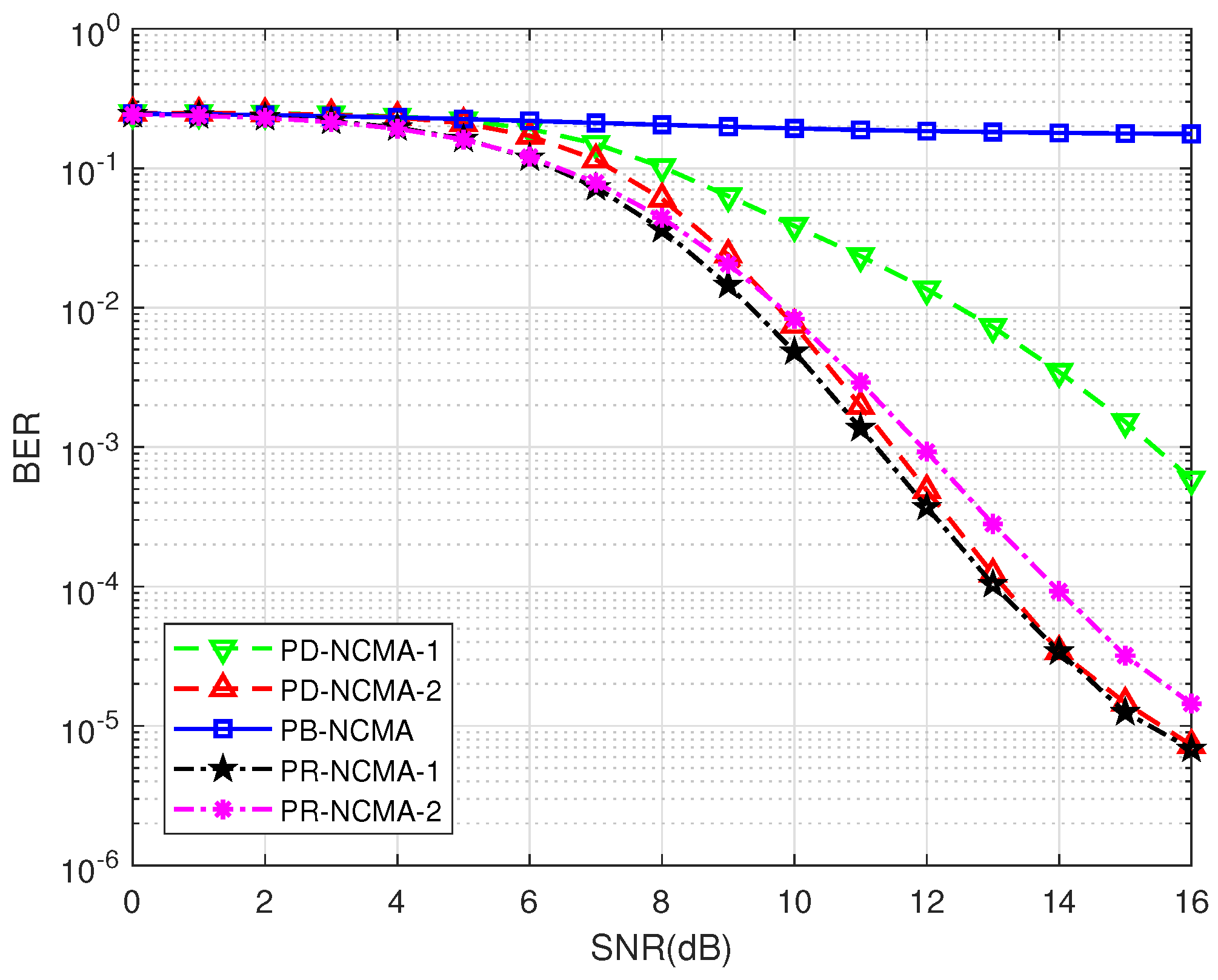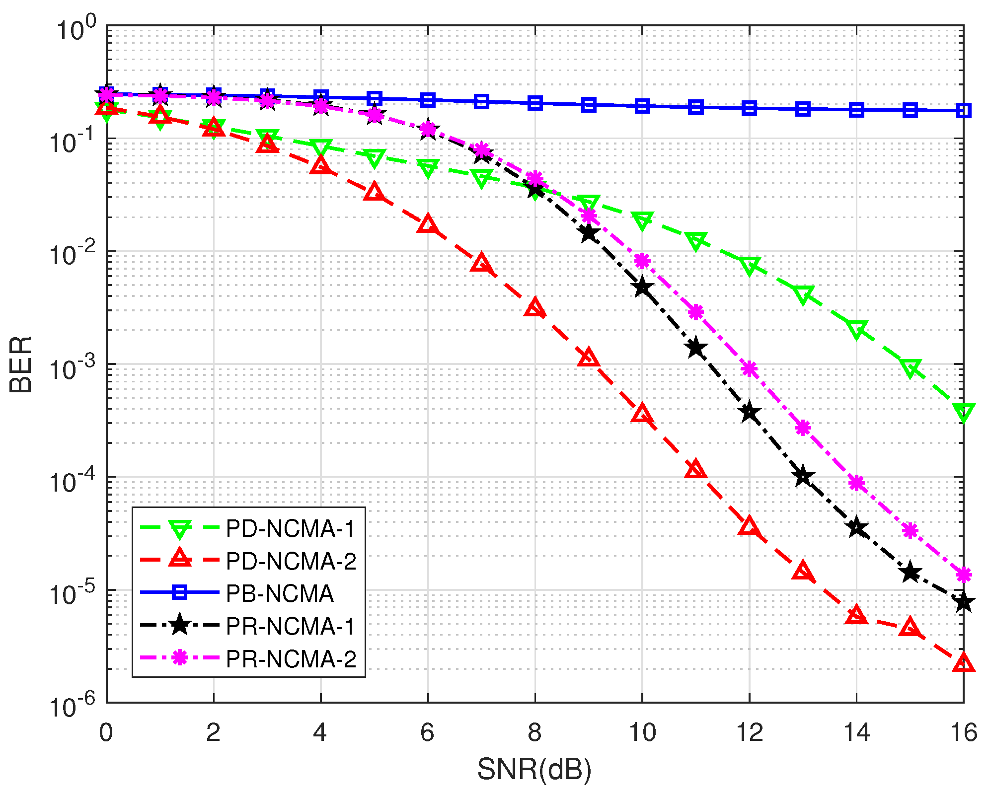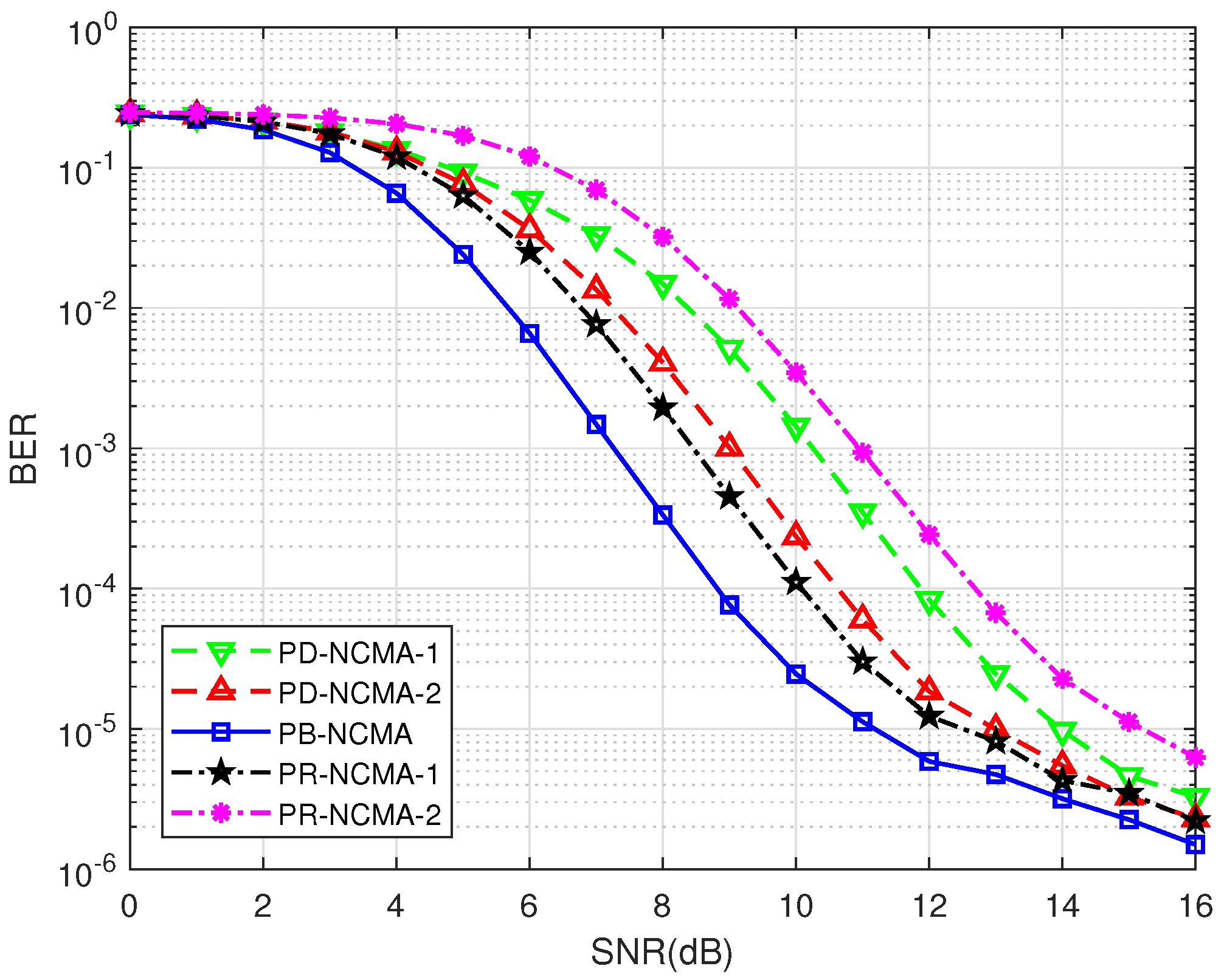 Figure 7 demonstrates the BER performance of the MUD decoder of user B. Since user B is the low-priority user within each cluster, the MUD performance of PD-NCMA-1 is obviously inferior to that of PR-NCMA. However, due to a better power differential clustering design, PD-NCMA-2 shows nearly the same performance as PR-NCMA-1, even surpassing PR-NCMA-2 at high SNRs. In addition, the performance of the proposed PD-NCMA is still much better than that of PB-NCMA.