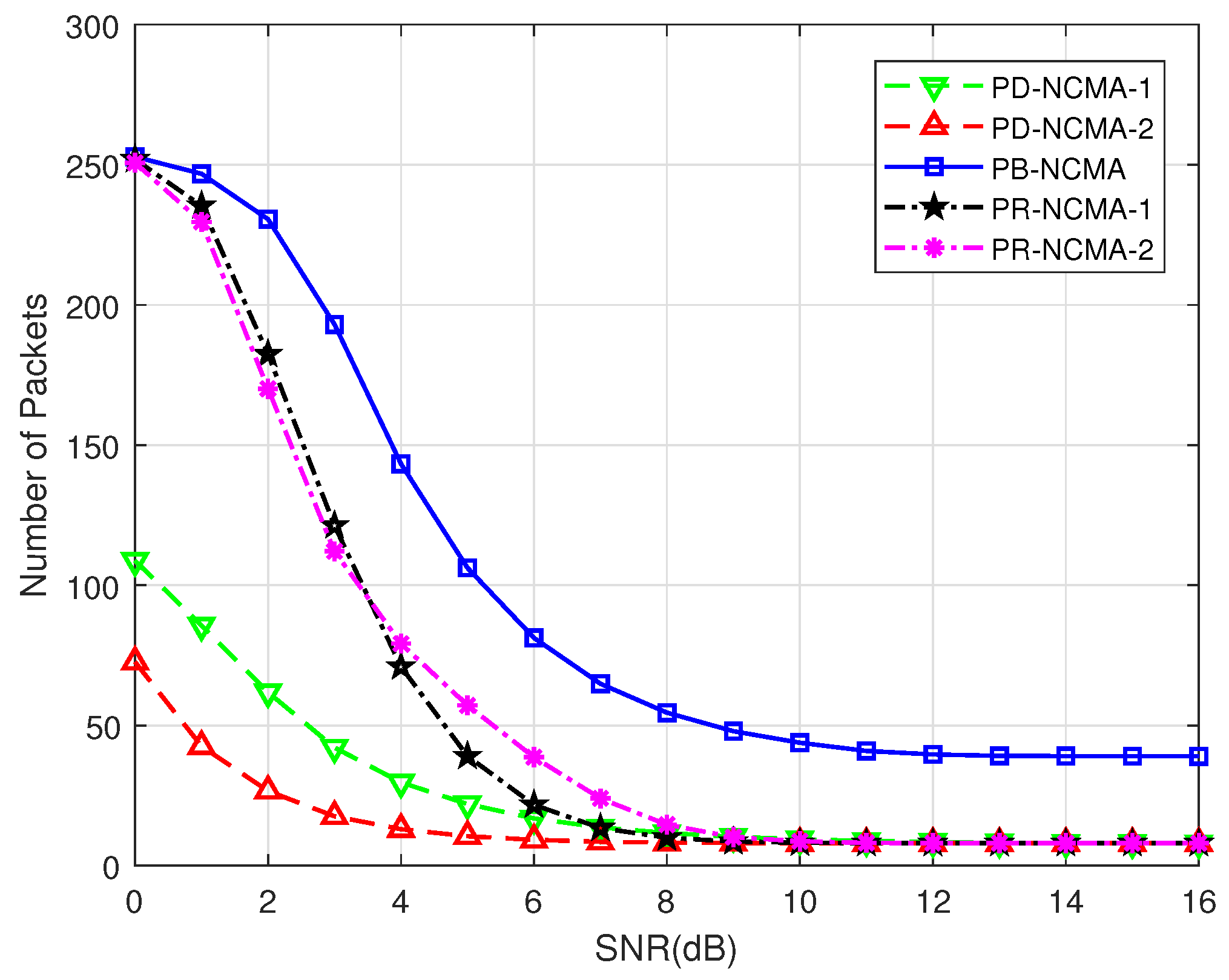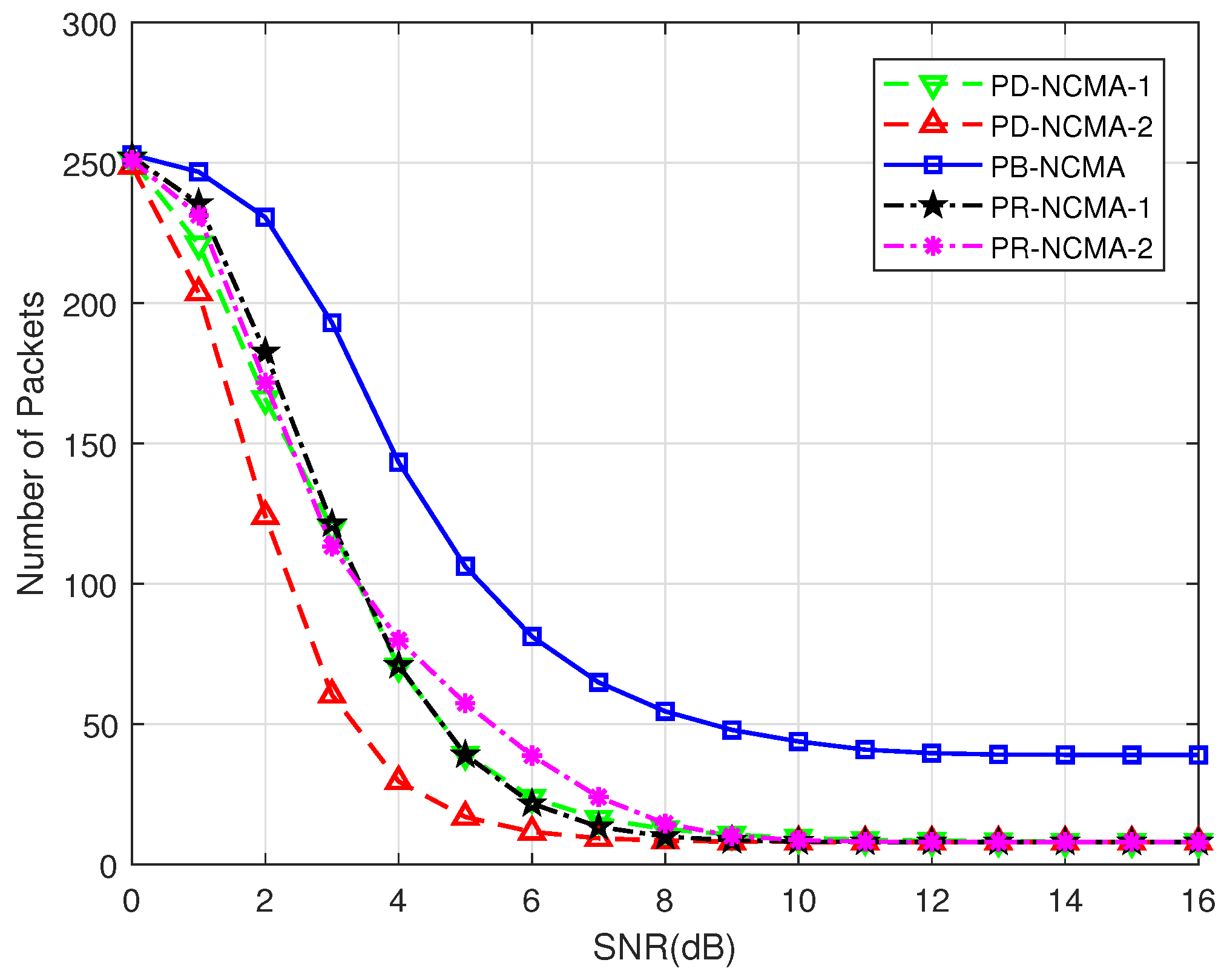 Figure 9 illustrates the number of packets required to correctly recover message M i A . Notice that we adopt L = 8 in the RS code; thus, the minimum number of packets to decode the message is 8. It can clearly been seen that both PR-NCMA and PD-NCMA can reach this lower bound in high-SNR ranges. Furthermore, PD-NCMA is fully ahead of other methods in low-SNR ranges, since the power-diverse design improves MUD performance significantly (Figure 6).
