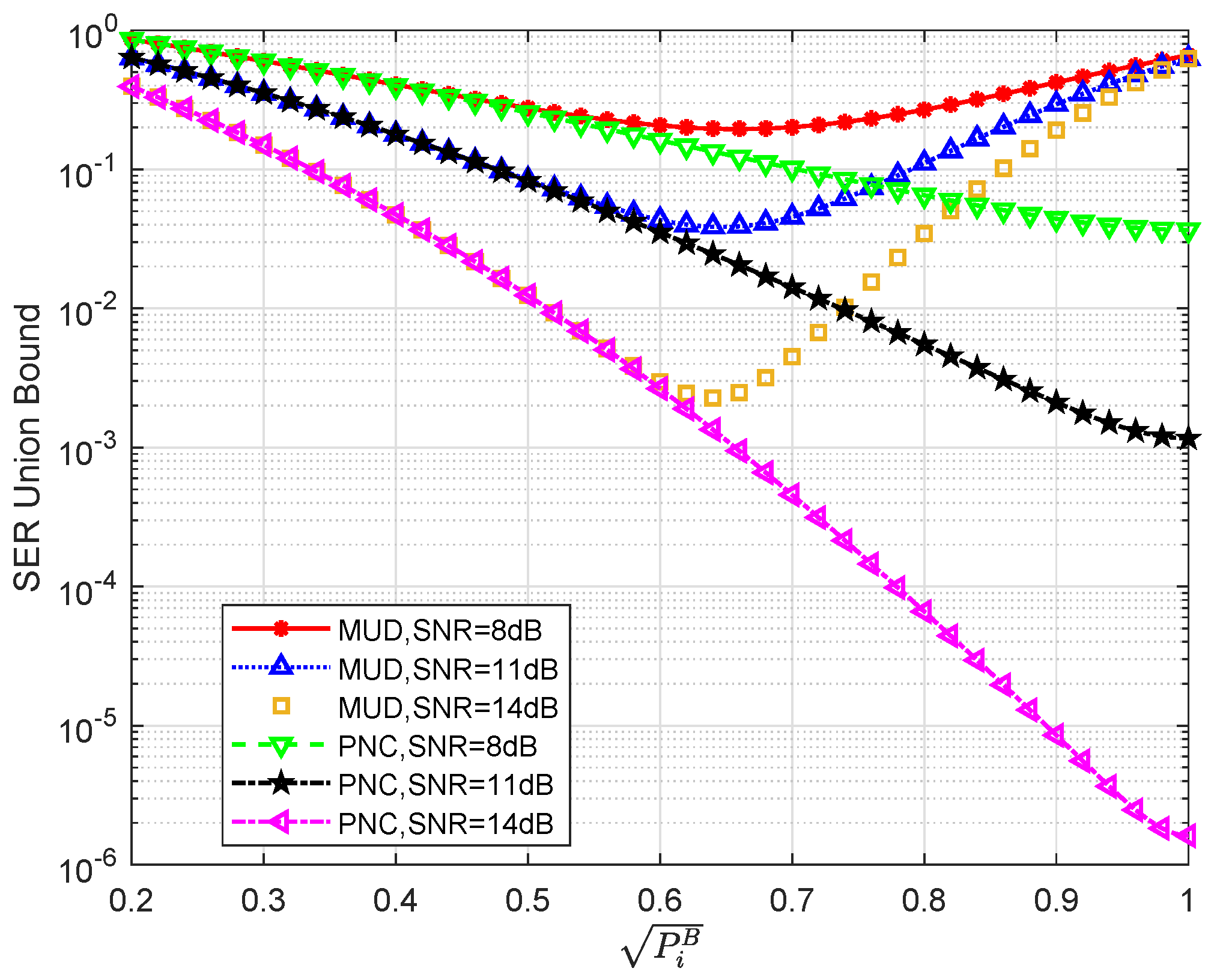 Figure 11 demonstrates the SER union bound of the MUD and PNC decoder under different P i B . It is worth noting that although PNC and MUD have almost the same SER union bound formulas (refer to (7) and (9)), their results are still quite different. P e P N C decreases gradually with the increase in power, while P e M U D decreases first and then increases. The main reason for this phenomenon is that the mapping operation of PNC is different from that of MUD Ω , which leads to different Euclidean distance statistics of superimposed constellation points (more details about mapping operation analyses can be found in [12]). Hence, it can be seen from Figure 11 that the specific value of P i B should be between 0.6 and 1.