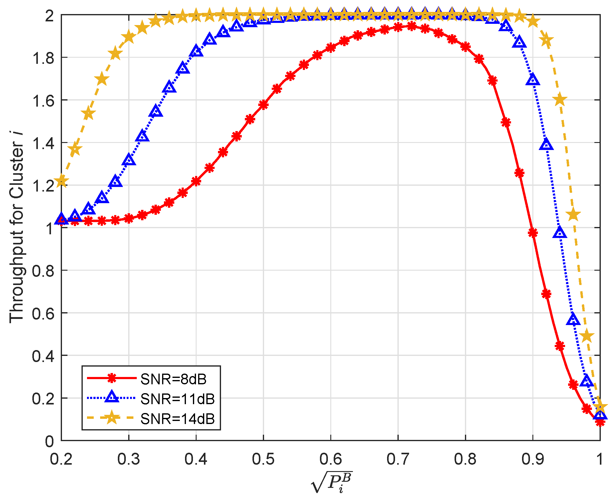 Then, we determine the specific value according to the throughput results within the cluster. From Figure 12, we can see that the throughput has a relatively stable performance between 0.69 and 0.75. Hence, we set P i B = 0.72 as the specific value to get better throughput performance. At this point, we have completed power allocation without considering priority. We refer to this approach as PD-NCMA-SV, and it is adopted in each cluster to further compare the overall throughput. Notice that PD-NCMA-SV adopts the same random grouping strategy as PB-NCMA and PR-NCMA; the only difference lies in power allocation.