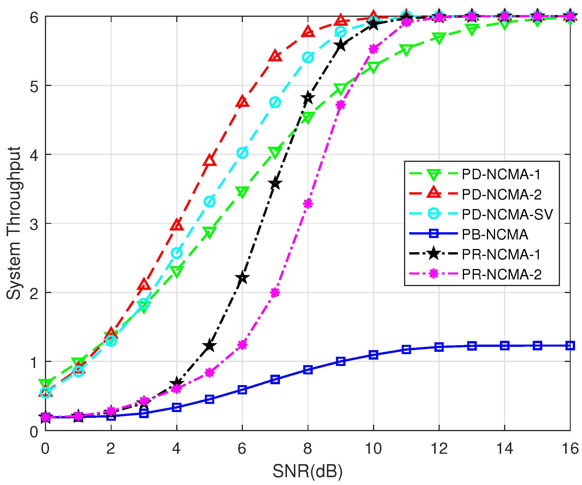In Figure 8, the PNC performances of PD-NCMA and PR-NCMA both show degradation, since the minimum distance of different XOR constellations is reduced. Nevertheless, due to the huge improvement in MUD, the performance degradation of the the PNC decoder has a negligible impact on overall performance. This can also be verified in throughput simulation.