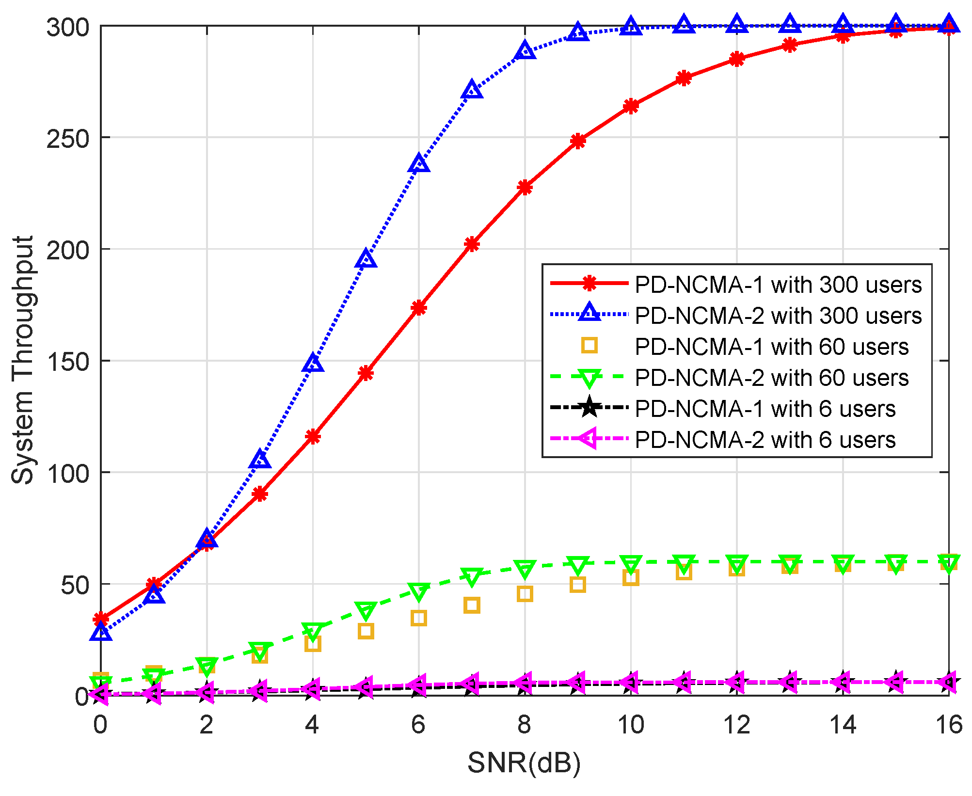 To verify the generalization performance of the proposed algorithm, we repeated the simulation with 6, 60 and 300 nodes while keeping the same RS code ( L = 8 ). As shown in Figure 14, the average throughput gain of PD-NCMA-2 over PR-NCMA-1 18–22% at 8 dB at the scenario of 300 users, which indicates that the algorithm remains applicable in large-scale user scenarios.
