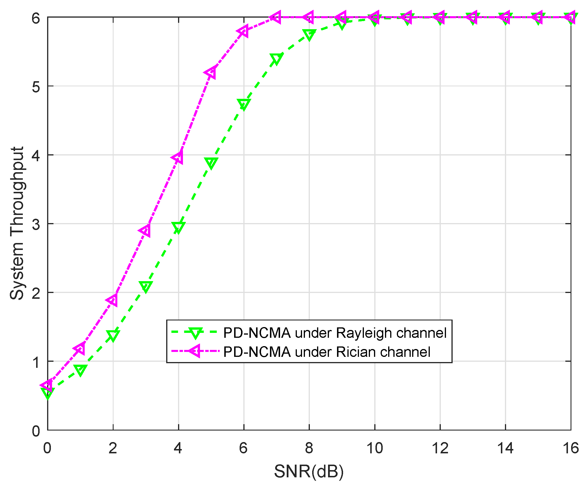 Besides, we have performed a comparative simulation of the PD-NCMA method under both the Rayleigh and Rician channels in Figure 15, where the Rician factor K = 5 is adopted. Other simulation parameters remain unchanged. The proposed algorithm can operate under different channels.