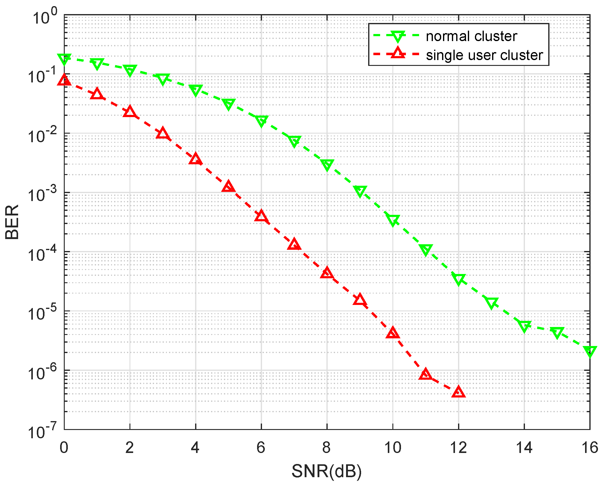 Figure 16 shows the comparison of BER performance between the user assigned higher power in a normal cluster of PD-NCMA and the user occupying full power. It is obvious that due to the advantage in power, the BER performance of the single user is significantly improved. Similar results can also be observed from the number of required packets to correctly decode the message.
