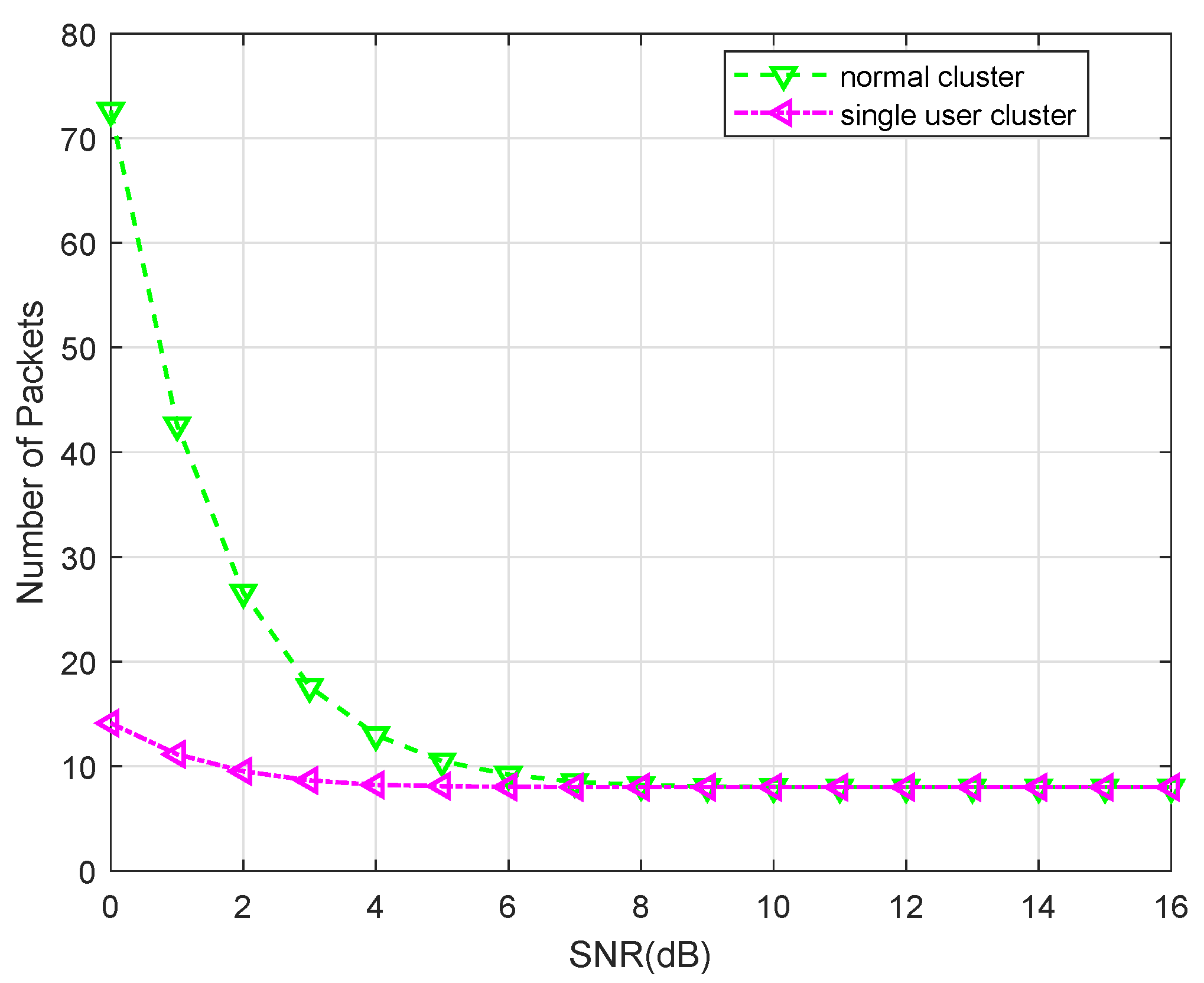 In a single-user cluster, the user has a full power budget and is not affected by superposed constellation points. Its BER and the number of packets required for correct reception will be better than those of paired users. Therefore, its performance will not become a bottleneck for the overall system. Relying on higher power, the MUD detector will exhibit excellent decoding performance in the low-SNR region. We conducted the following simulation.