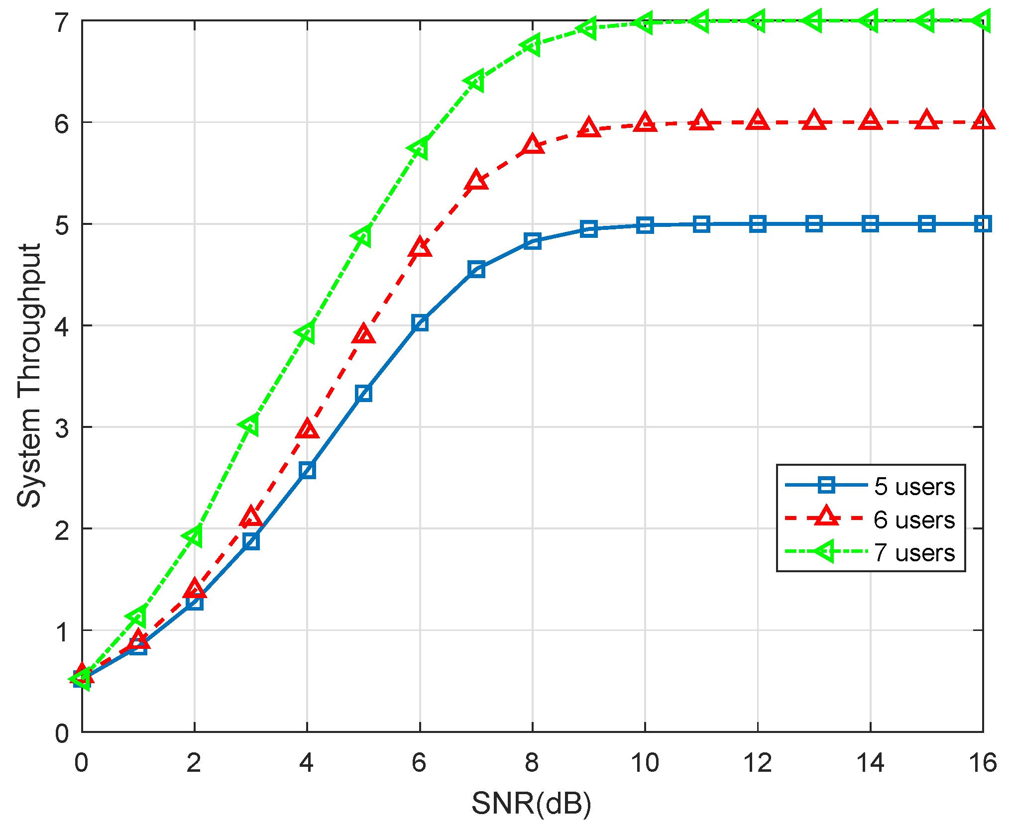 As can be seen from Figure 18, the final throughput of systems with different numbers of users approaches the upper limit value. In the low-SNR region, the difference in performance is relatively small.