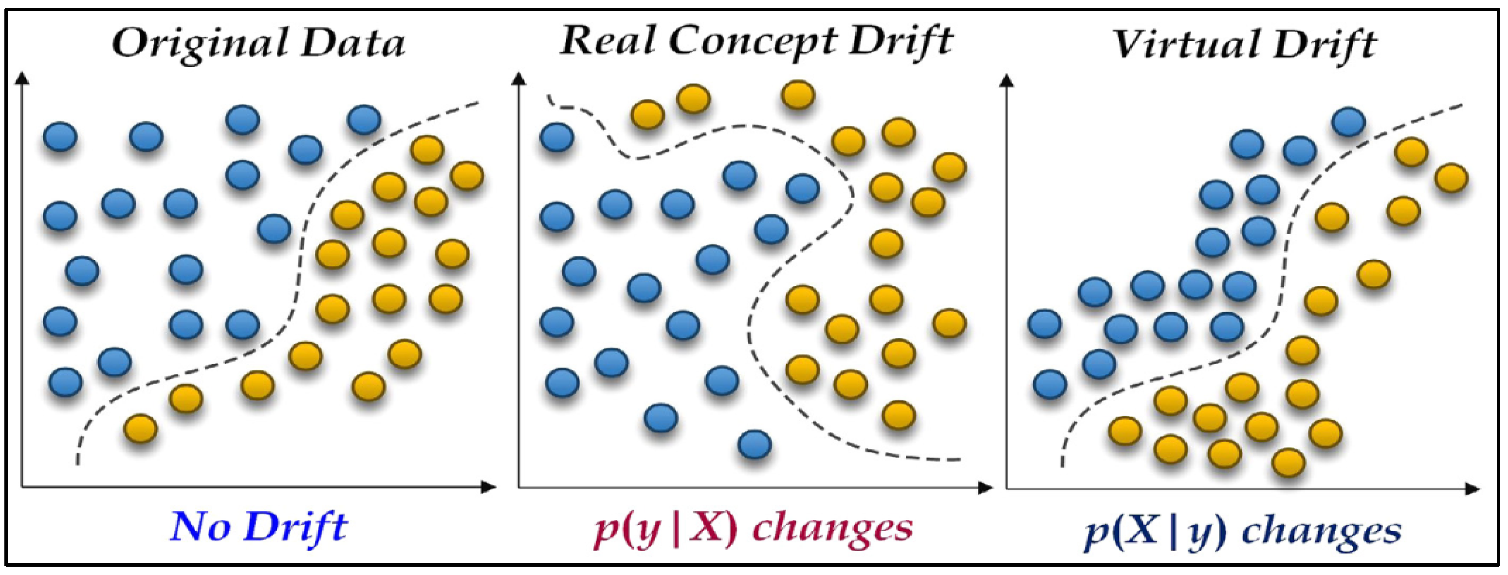 - Unpredictable Statistical Changes: The statistical properties of data unpredictably change, a phenomenon known as “concept drift.” This means that insights derived from older data may become obsolete, potentially degrading the model’s performance. Therefore, it is crucial to detect these changes and update the model accordingly to maintain its efficacy.