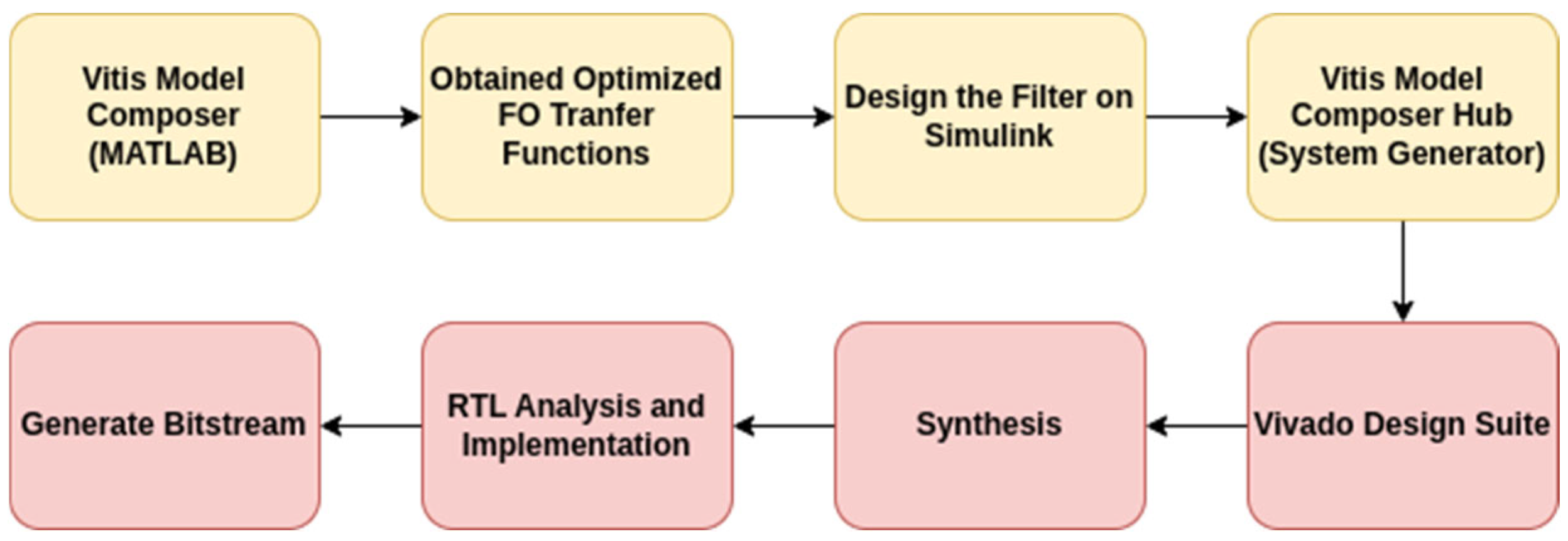 https://www.xilinx.com/products/design-tools/vitis/vitis-model-composer.html, accessed on 8 October 2025). The tool generates the corresponding IP core for the function, which is then utilized in the Vivado Design Suite for synthesis, Register Transfer Level (RTL) analysis, implementation, and bitstream generation for deployment on the FPGA device. The overall process is illustrated in the block diagram shown in