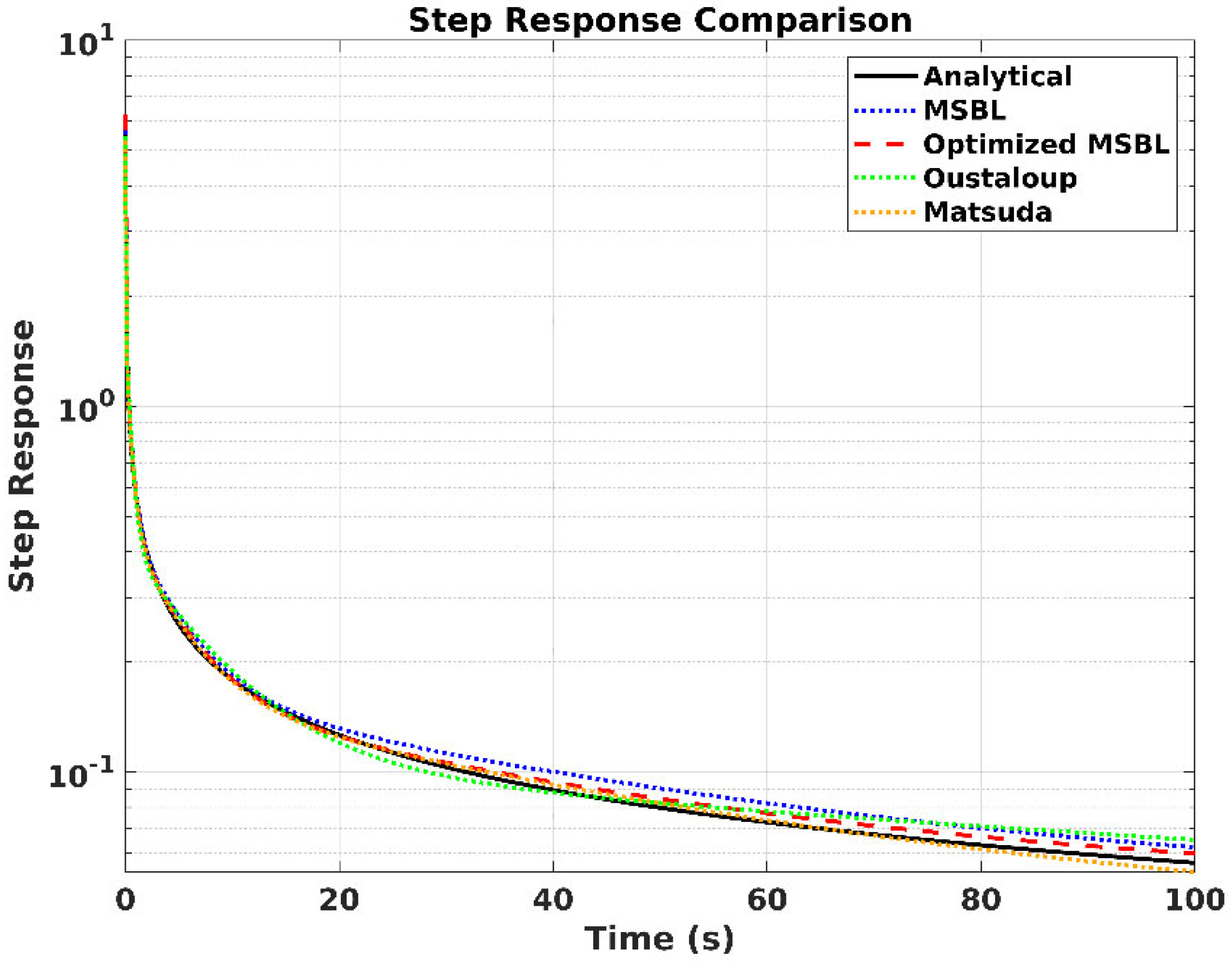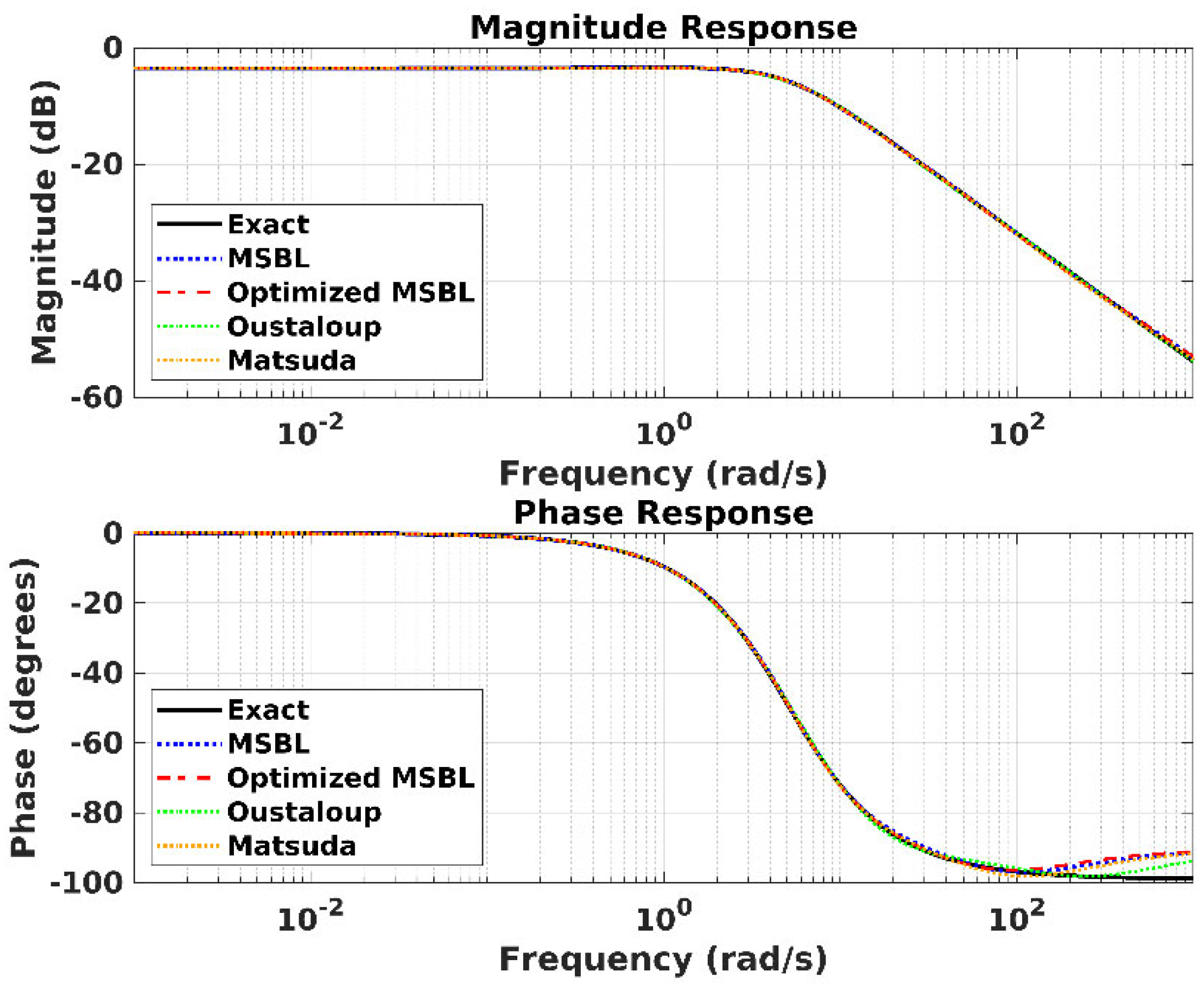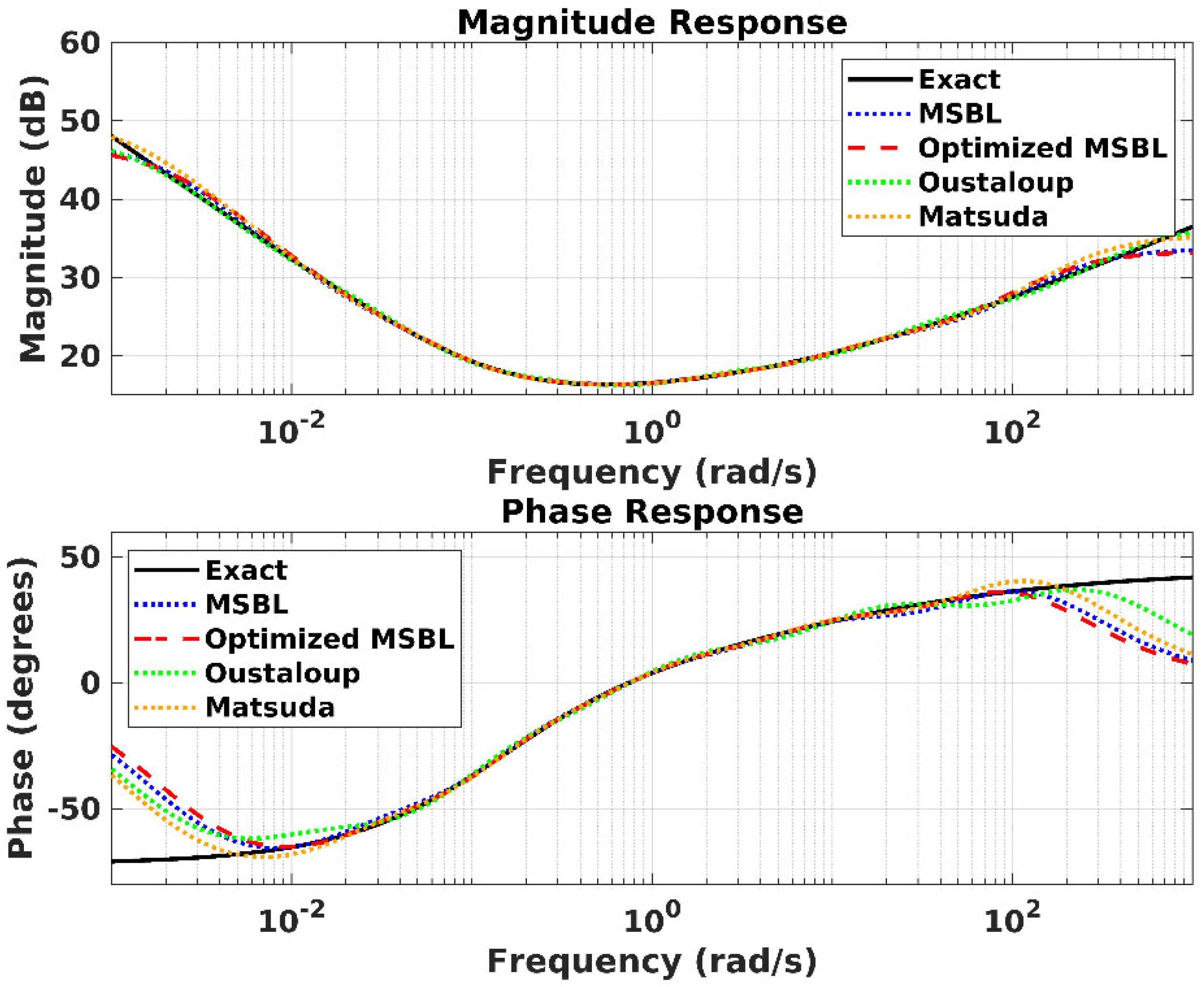 Therefore, while all three methods (MSBL, Oustaloup, and Matsuda) aim to produce a stable, rational integer-order transfer function, their core difference lies in the pole–zero placement strategy: MSBL uses a direct logarithmic distribution, Oustaloup uses a recursive geometric progression to maintain a flat phase response, and Matsuda uses a direct frequency–response fitting algorithm. As noted, in-depth analyses and derivations of these methods are available in the literature.