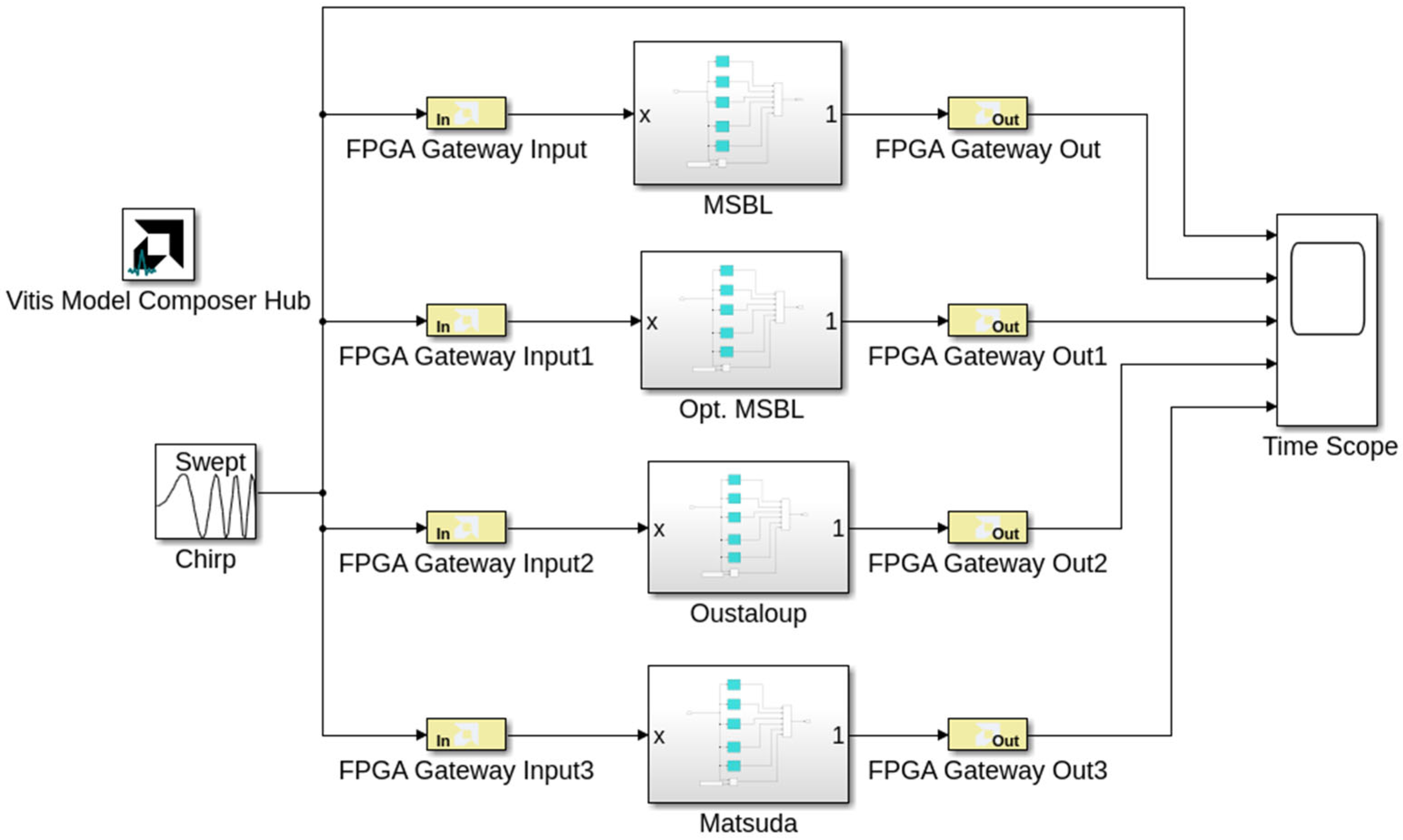 The Vitis Model Composer Hub system generator, developed by Xilinx Inc. from San Jose, CA, USA, enables the implementation of FPGA applications through a model-based design approach within MATLAB Simulink [