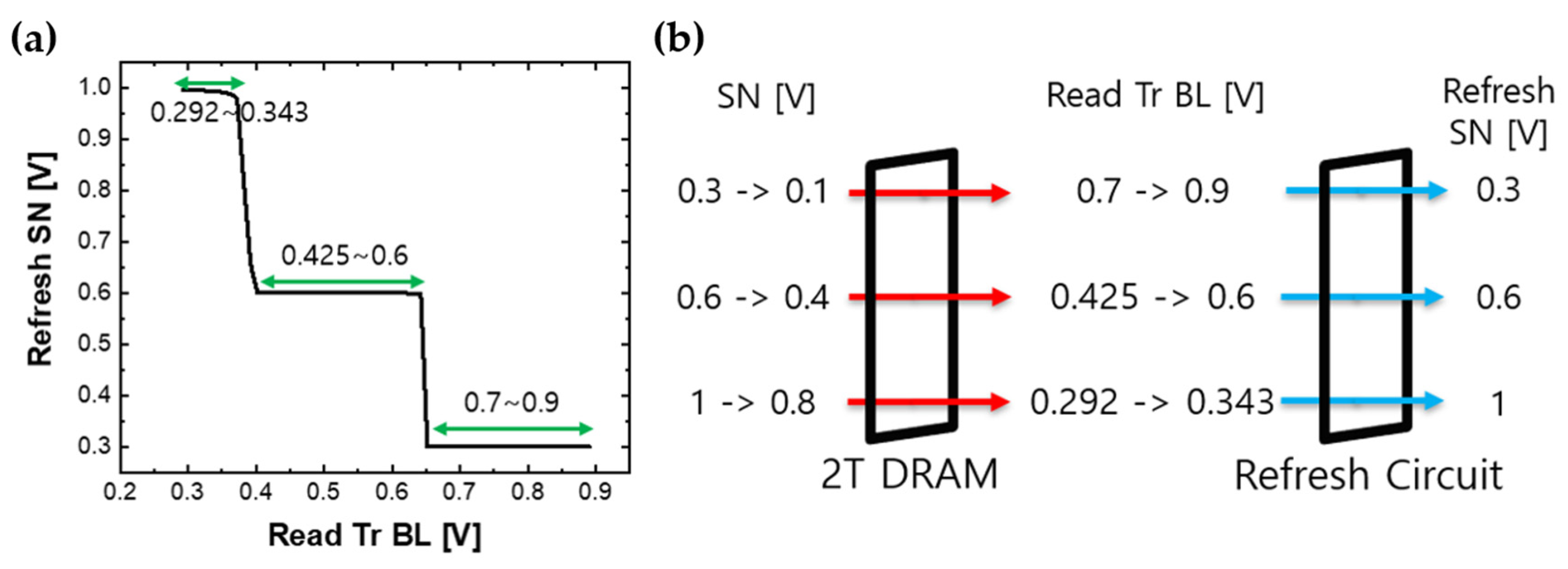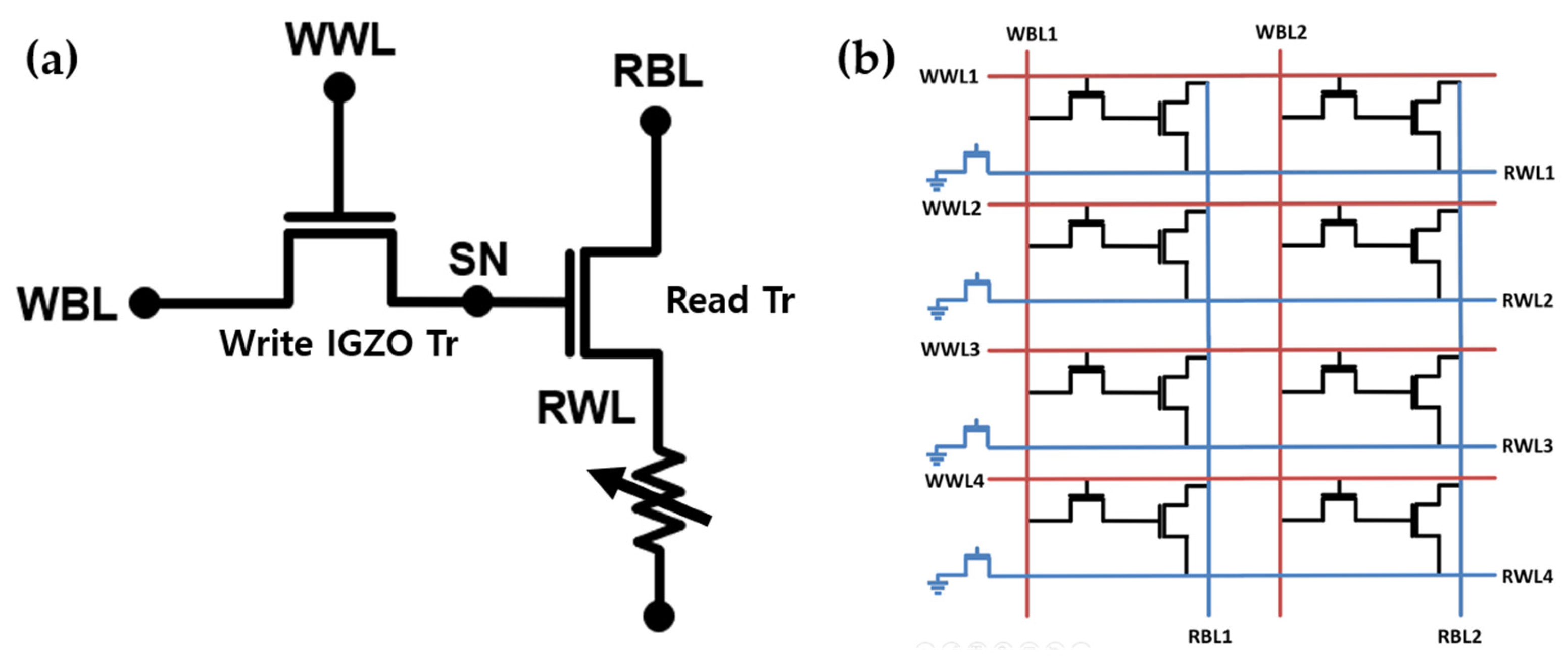 - Lu, W.; Chen, K.; Liu, M.; Liao, F.; Wu, Z.; Mao, N.; Li, Z.; Zhang, X.; Lu, C.; Niu, J.; et al. IGZO 2T1C DRAM with Low Operation Voltage and High Current Window. IEEE J. Electron. Devices Soc. 2025, 13, 444–449. [Google Scholar] [CrossRef]