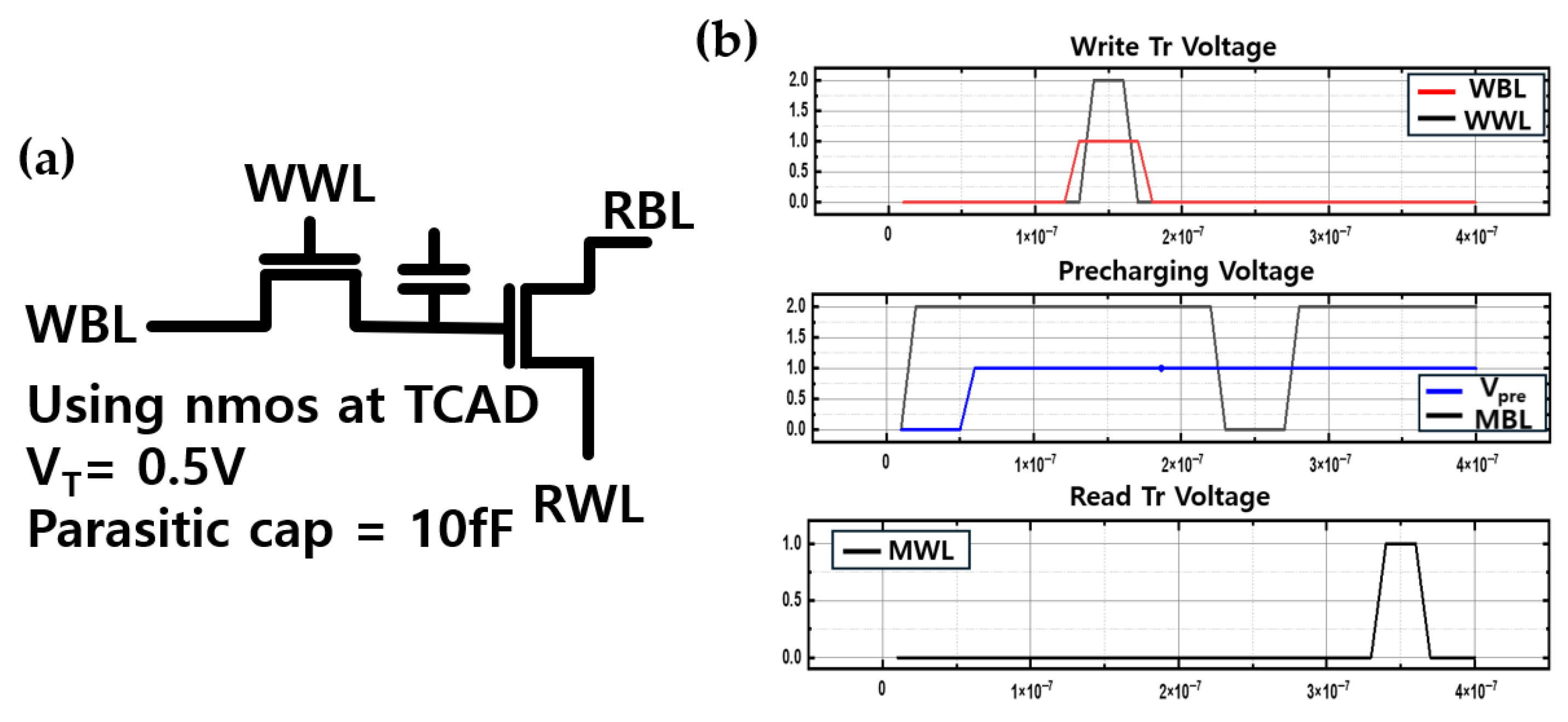 - Zhu, Z.Y.; Kang, B.M.; Dan, W.; Wu, X.S.; Son, J.; Yu, Y.; Xiao, D.-Y.; Dai, J.; Wang, G.-L.; Yoo, A.; et al. Novel 2T DRAM by Storing Data in One Alternative Gate of a Double-Gate Transistor with a Low-leakage Oxide Transistor. In Proceedings of the 2022 IEEE 16th International Conference on Solid-State & Integrated Circuit Technology (ICSICT), Nanjing, China, 25–28 October 2022; IEEE: Piscataway, NJ, USA, 2022. [Google Scholar]