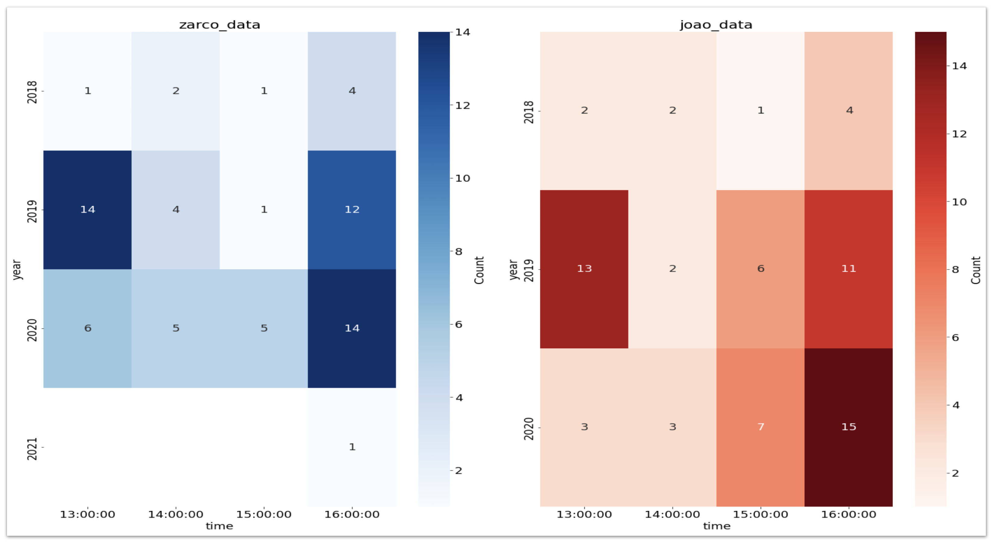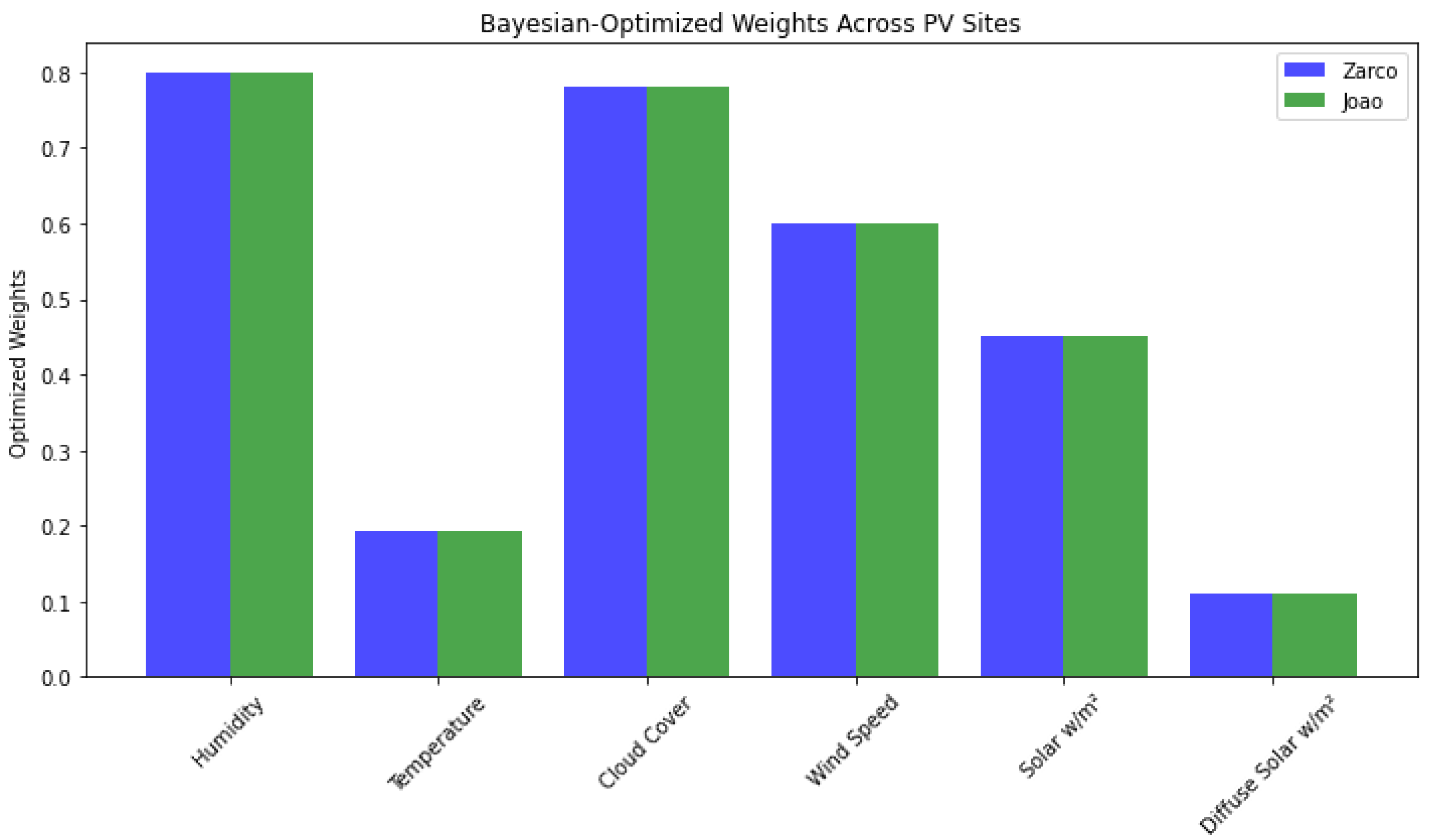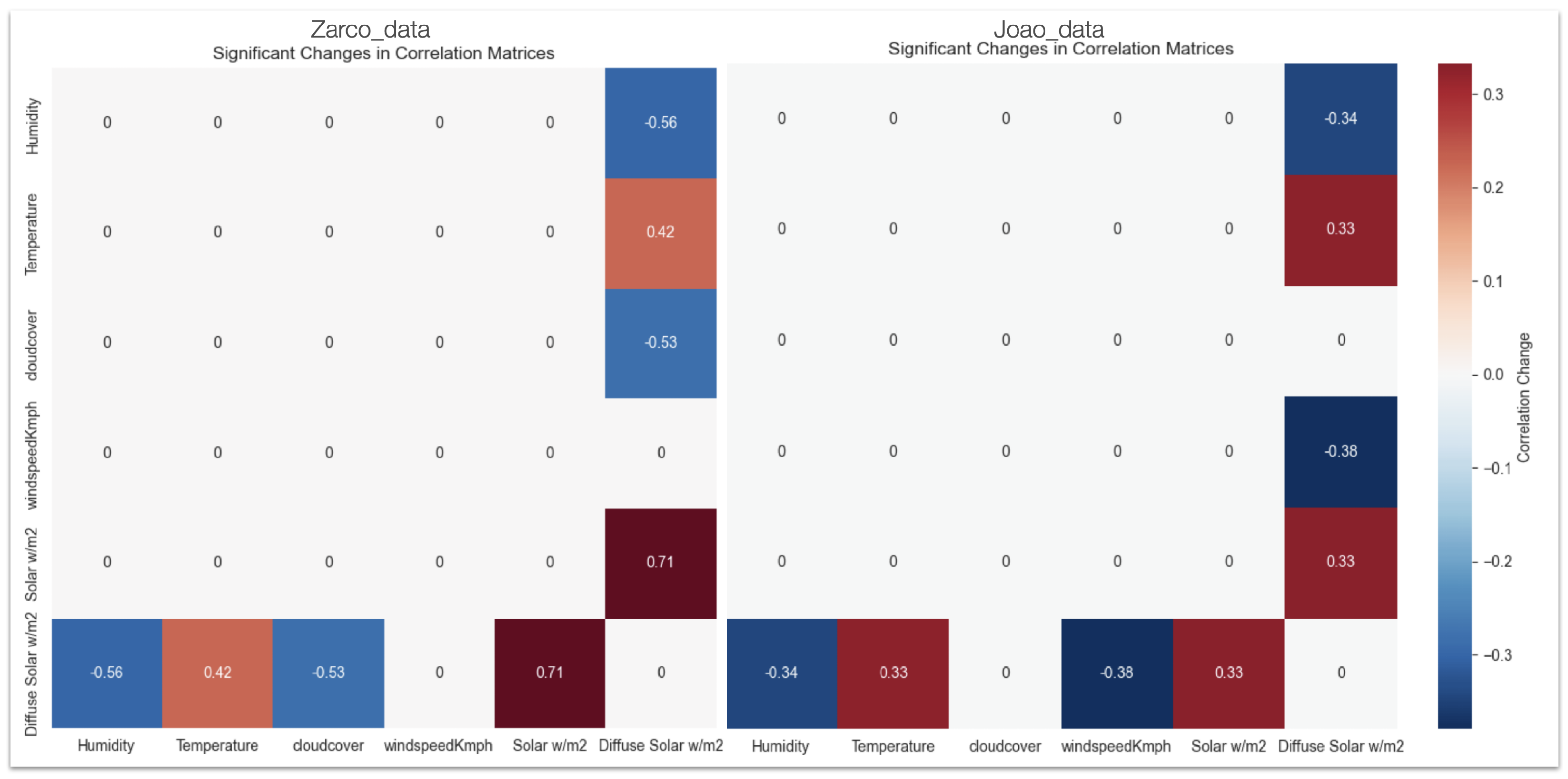 In the case of the João data, a positive correlation () was found between solar w/m2 and diffuse solar w/m2. Furthermore, diffuse solar w/m2 showed negative correlations with humidity () and WindspeedKmph (). The differences in the magnitude of correlations between Zarco and João are evident. For example, “Solar w/m2” and “Diffuse Solar w/m2” have a stronger correlation in Zarco () than João (). Despite these differences, the DISC-thresholding algorithm isolates significant changes relative to their respective normal scenarios. This ensures that the correlation structure is normalized within each farm’s dataset, making it comparable across farms during the weight shifting optimization process.