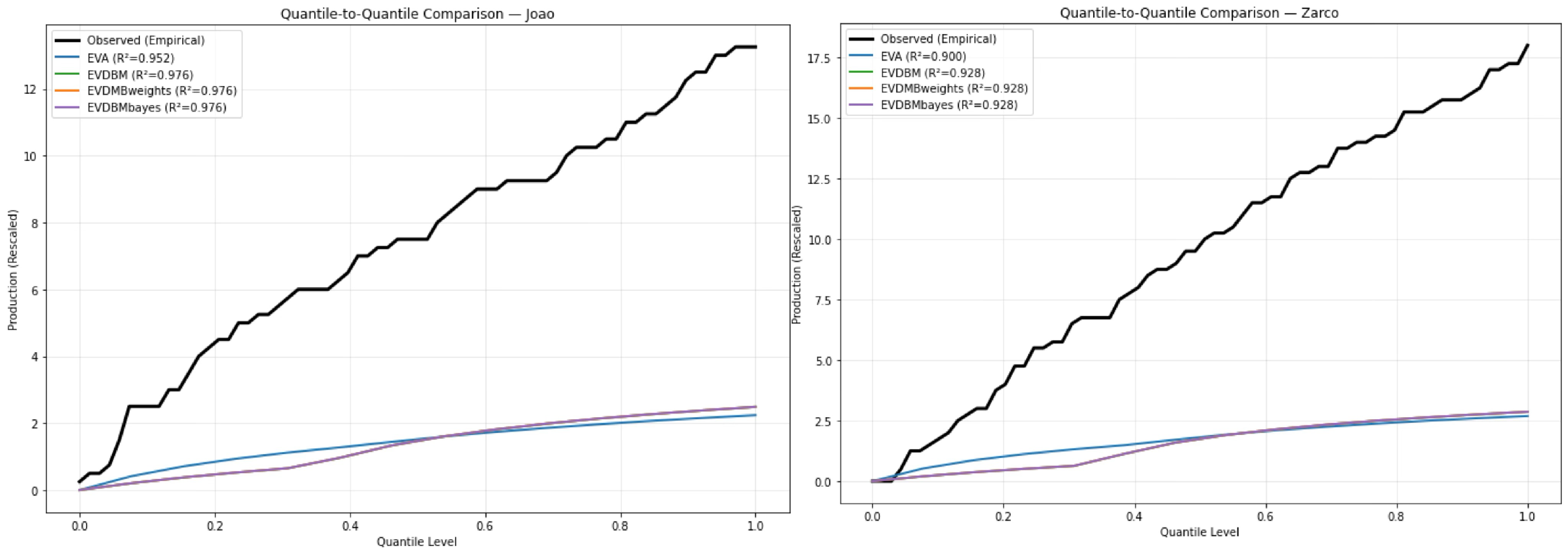 Figure 10 illustrates the empirical–model quantile correspondence for the João and Zarco datasets. The black curve denotes the observed empirical quantiles, while the colored lines correspond to modeled quantiles from EVA and the proposed EVDBM variants. For both datasets, EVDBM and its optimized variants (weighting and Bayesian optimization) demonstrate visibly improved tail alignment relative to EVA, with
