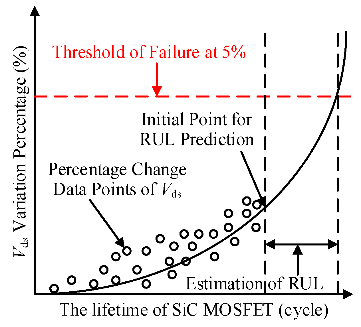 - Dusmez, S.; Duran, H.; Akin, B. Remaining useful lifetime estimation for thermally stressed power MOSFETs based on on-state resistance variation. IEEE Trans. Ind. Appl. 2016, 52, 2554–2563. [Google Scholar] [CrossRef]