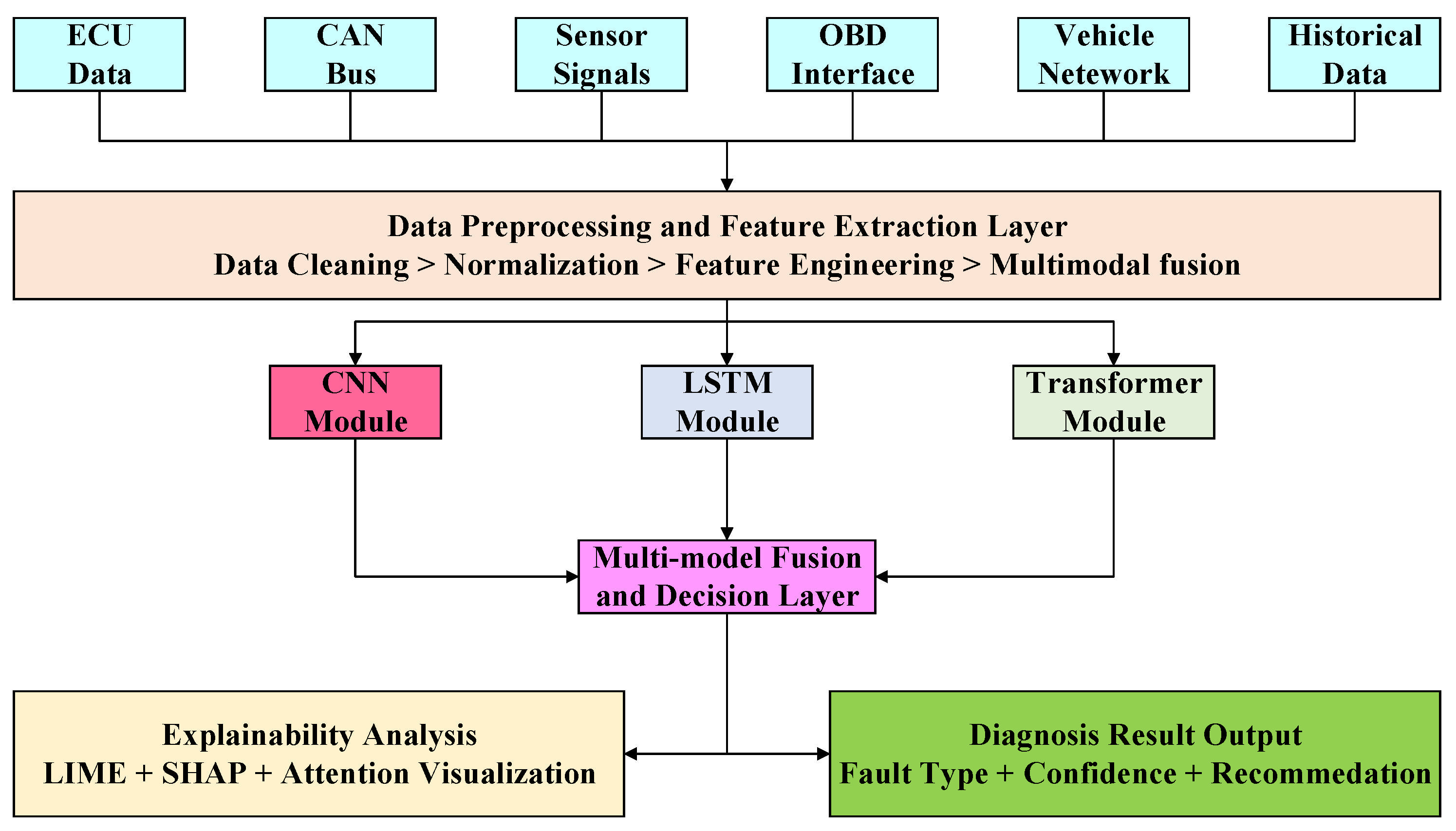 The overall real-time automotive fault diagnosis workflow, from multi-source data acquisition to explainable decision outputs, is illustrated in