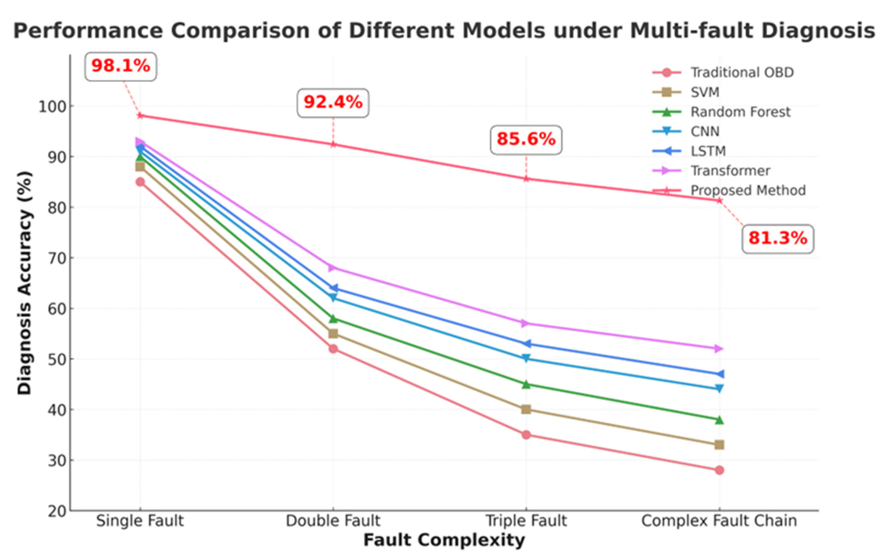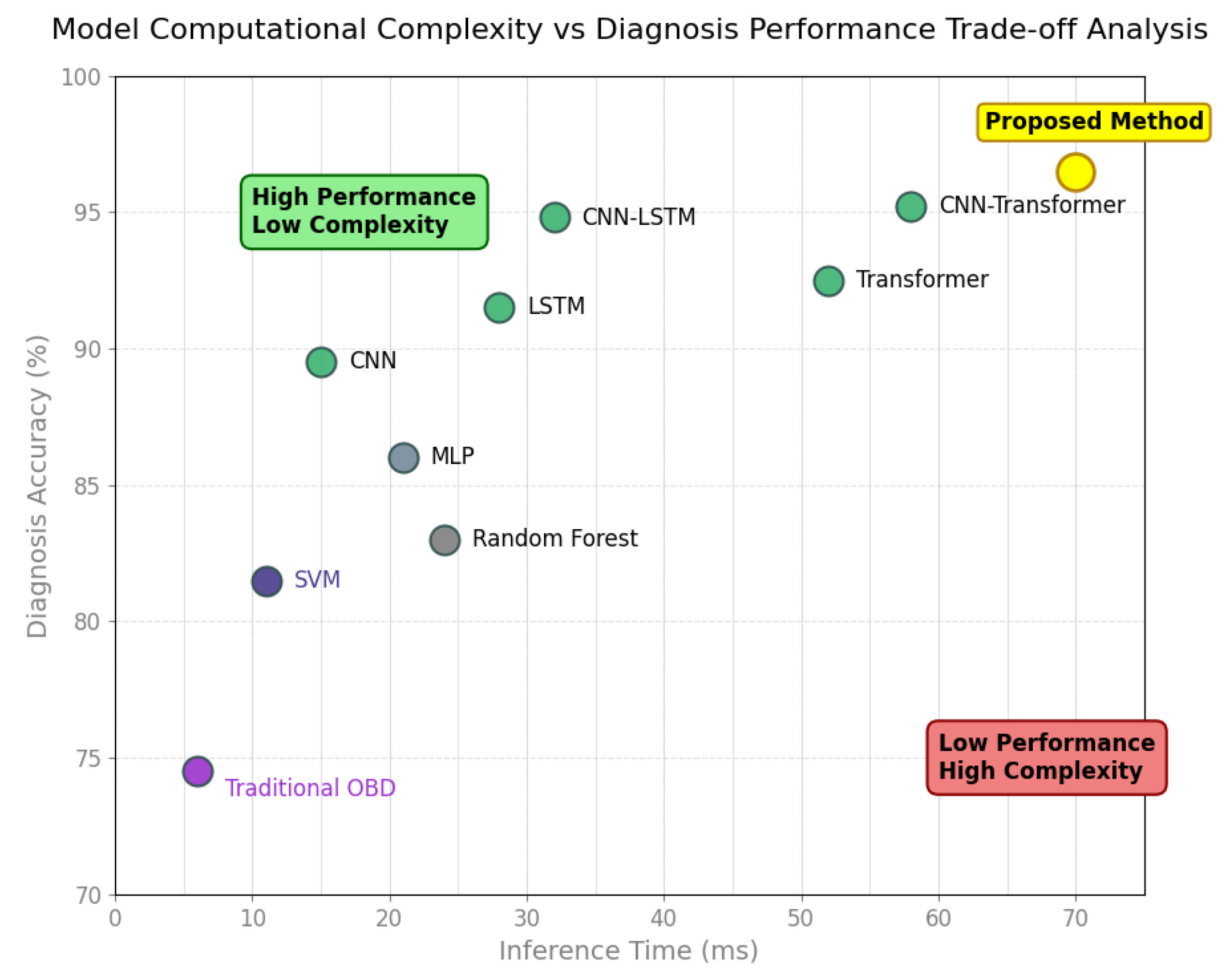 To validate the superiority of the deep learning architecture, this study further compared its results with traditional diagnostic methods. The rule-based OBD system achieved an accuracy of only 74.2%, with a high misdiagnosis rate of 31.5% in multiple-fault scenarios. Statistical learning methods such as Support Vector Machine (SVM, 81.6%) and Random Forest (83.4%) showed reasonable performance with sufficient feature engineering but had limited capability in handling temporal and non-linear patterns. A shallow neural network (MLP, 85.7%) performed slightly better than statistical methods but was still inferior to deep learning models. In contrast, the triple fusion architecture of this study achieved an accuracy of 96.8%, an improvement of 13.4 percentage points over Random Forest, which corresponds to a reduction in the error rate of nearly 80%.