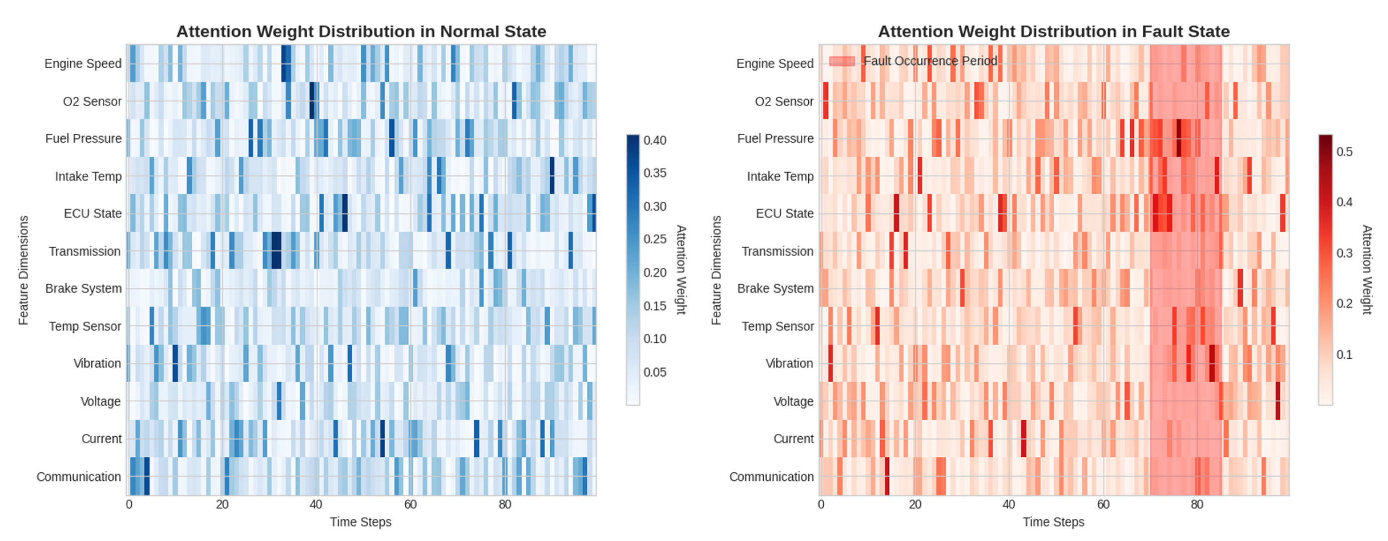 Figure 8. For example, in engine control fault diagnosis, the oxygen sensor signal, fuel pressure, and intake air temperature sequentially served as key evidence. The attention mechanism further revealed critical time periods for diagnosis, such as abnormal fluctuations in engine speed 30 s before a fault occurred. The corresponding attention-weight heatmap over time and feature dimensions is shown in