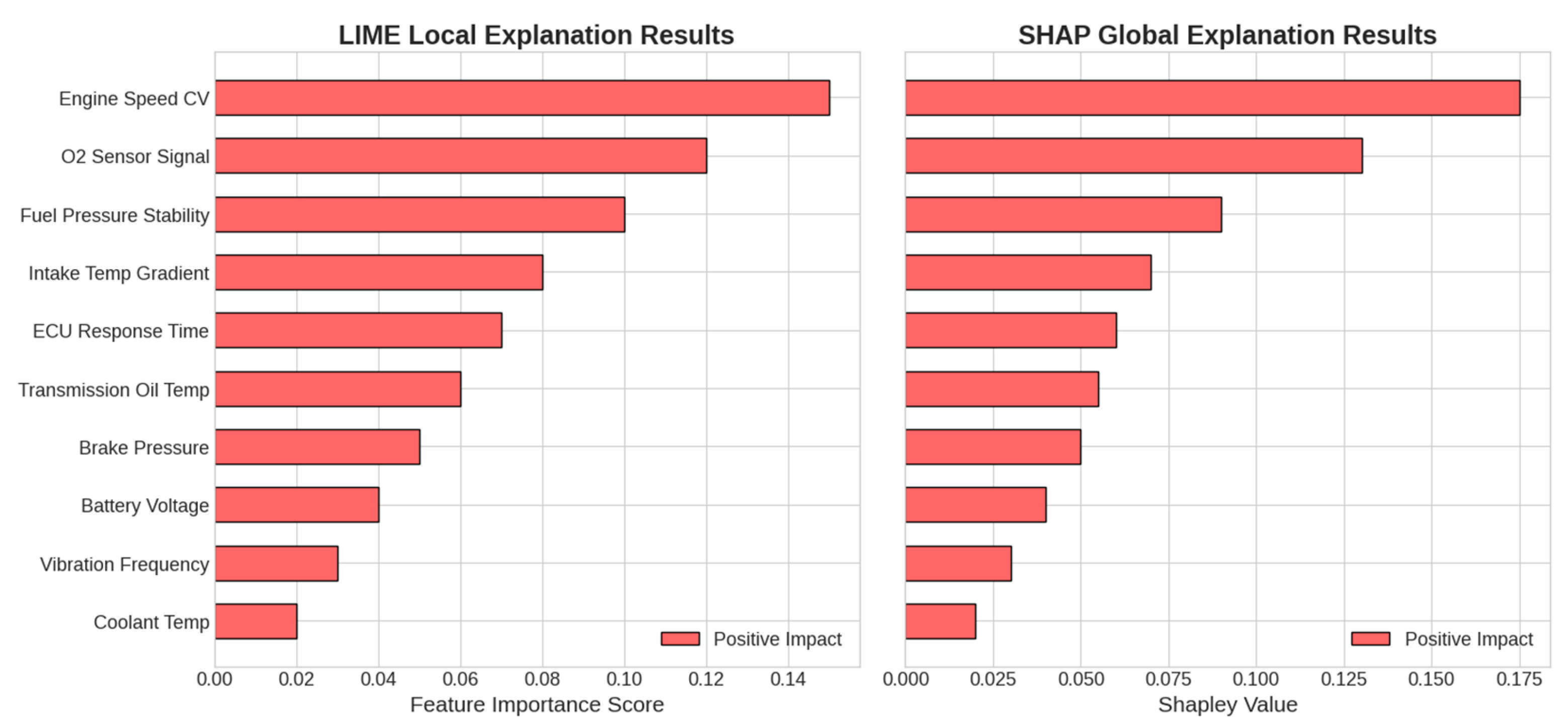 The SHAP-based feature attribution analysis demonstrated that the engine-speed coefficient of variation contributed the highest Shapley value (0.175), followed by the oxygen-sensor signal amplitude (0.132) and fuel-pressure stability (0.090). These parameters represent core indicators of dynamic combustion control and thus provide physically interpretable explanations for the model’s diagnostic outputs. The LIME local interpretability results yielded a consistent ranking pattern, confirming the model’s internal coherence. A side-by-side comparison of feature importance rankings produced by LIME and SHAP is provided in