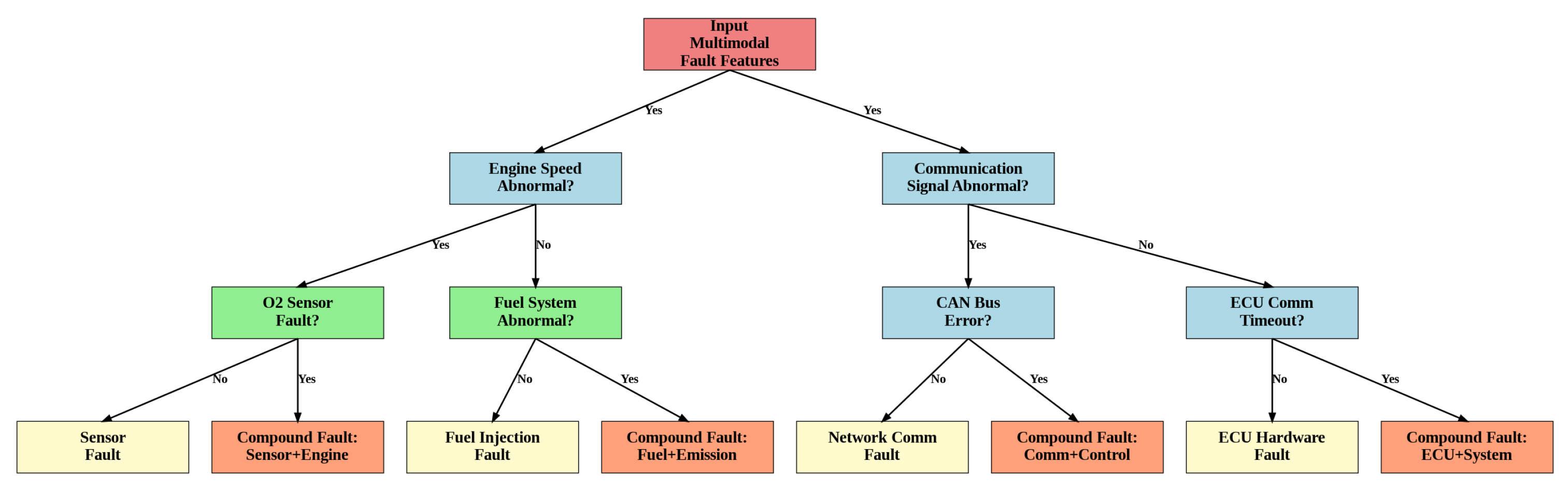 Traditional automotive fault diagnosis relies primarily on the On-Board Diagnostics (OBD) framework, which detects anomalies via predefined Diagnostic Trouble Codes (DTCs). However, as system interconnections grow denser, conventional methods face significant limitations. Their single-point detection logic cannot efficiently handle correlated or cascading faults. When concurrent anomalies occur in several subsystems, a large number of misleading fault codes are often generated, making root-cause identification difficult for technicians [