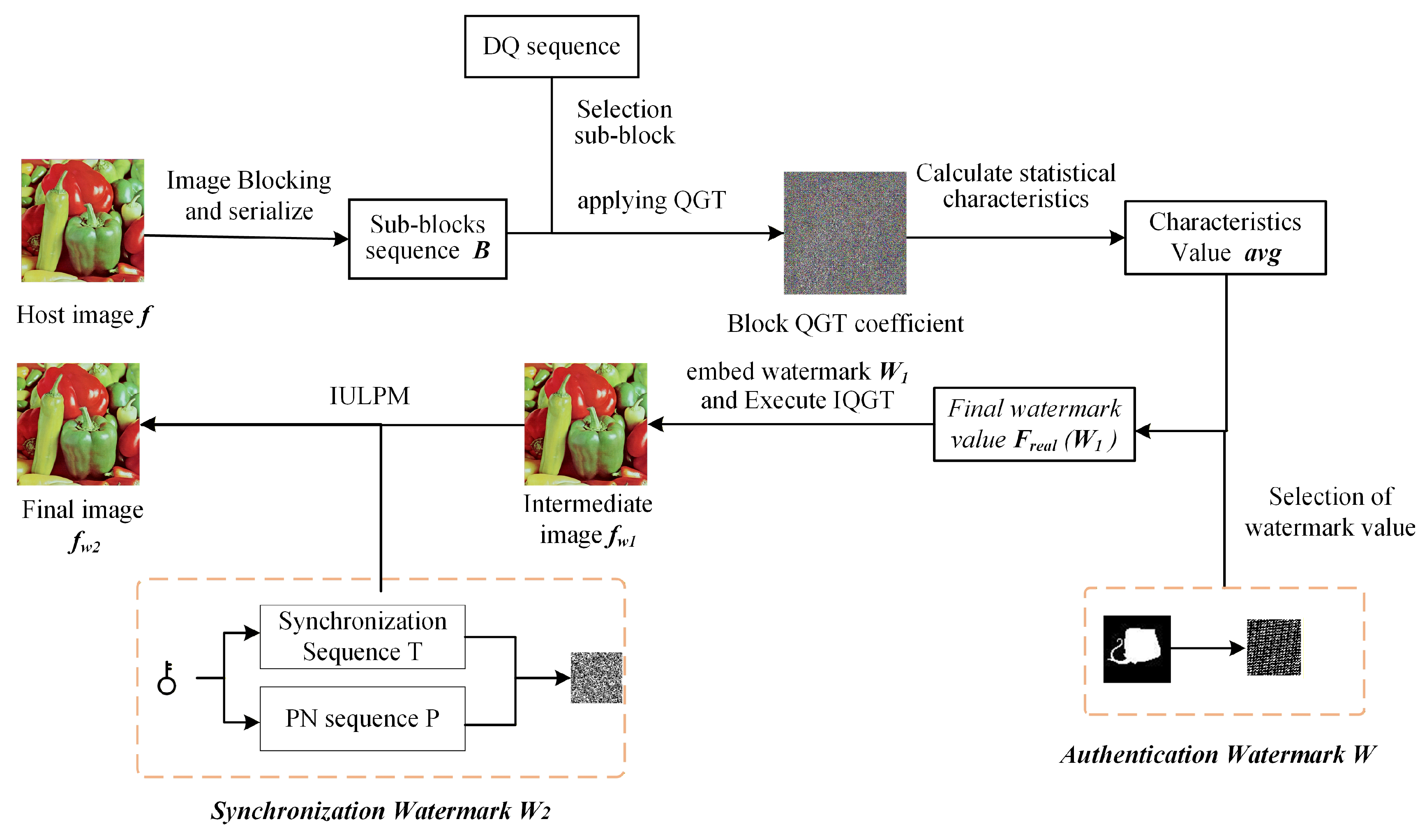 A watermark embedding framework integrating QGT, using the neighborhood coefficient to determine the final watermark value, embedding the authenticated watermark in the real component of the quaternion coefficient, and then embedding the synchronous watermark in combination with the IULPM method to complete the embedding of the final watermark. This method increases the security and layout against geometric attacks. Meanwhile, through the embedding sequence of DQ, it can not only maintain the visual fidelity but also enhance the security of the watermark.
