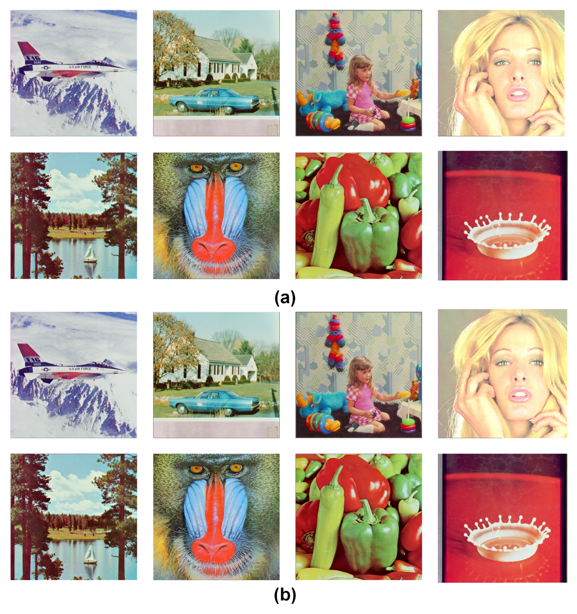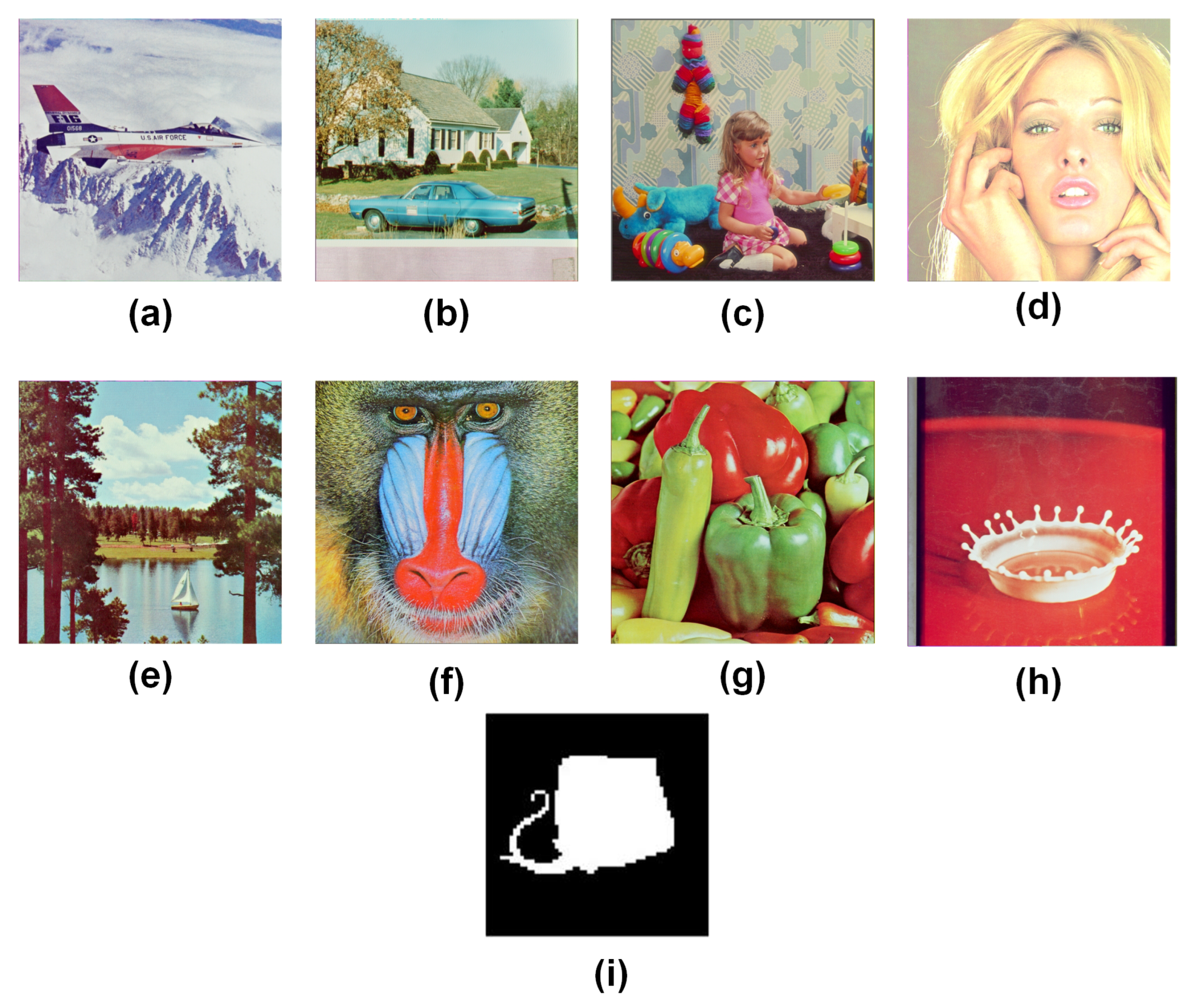 Since the time complexity of the quaternion Gyrator transformation itself for processing images is , when processing the host image and performing block operations, it requires an execution of the quaternion Gyrator transformation at the order of . Therefore, the overall time complexity of the proposed algorithm is of the order of .