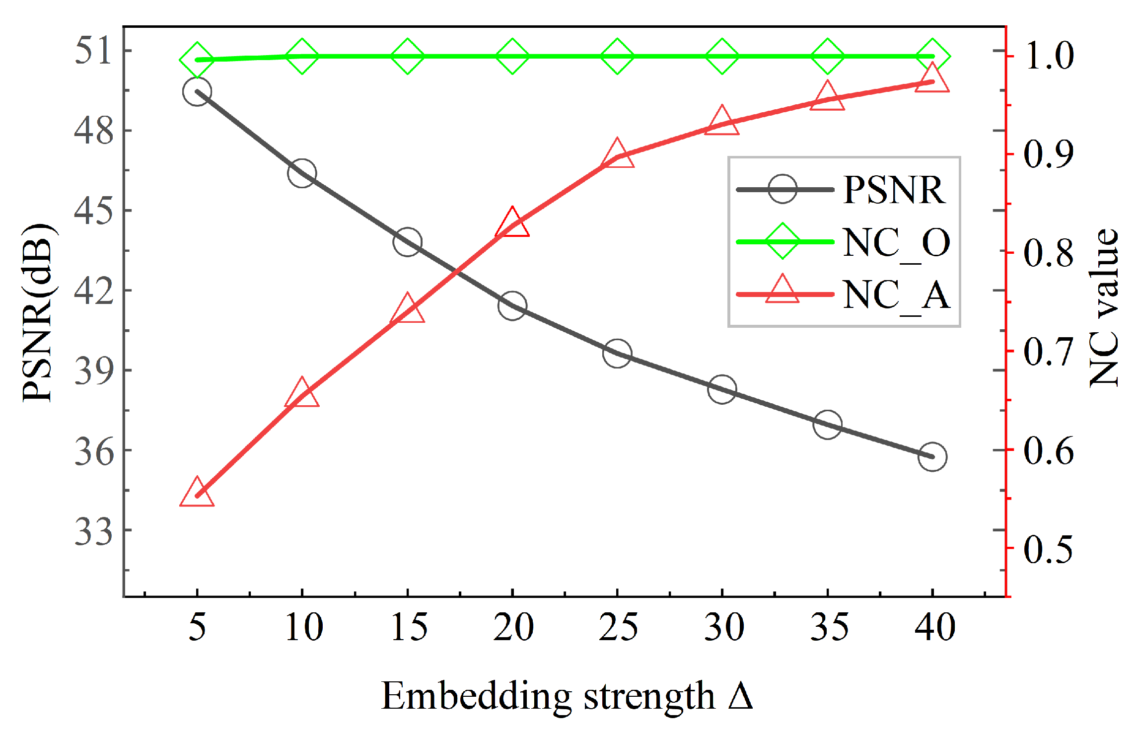 In the field of digital watermarking technology, robustness specifically refers to the watermarking algorithm’s anti-interference ability to maintain the recognizability and integrity of the watermarked information after the carrier image has been subjected to malicious attacks such as geometrical deformation, filtering processing, compression, and degradation. This index becomes a core parameter for evaluating the security level of algorithms by quantifying the tolerance threshold of the watermarking system to attacks. In this study, the attack resistance of watermarking algorithms is quantitatively evaluated by NC. Initially, the watermarked images are subjected to various assaults. Next, the watermarked icons are restored from every hacked watermarked icon using the extraction as well as decryption techniques explained in detail in the previous section. Finally, the NCs are calculated among the pristine and restored watermarked images using Equation (