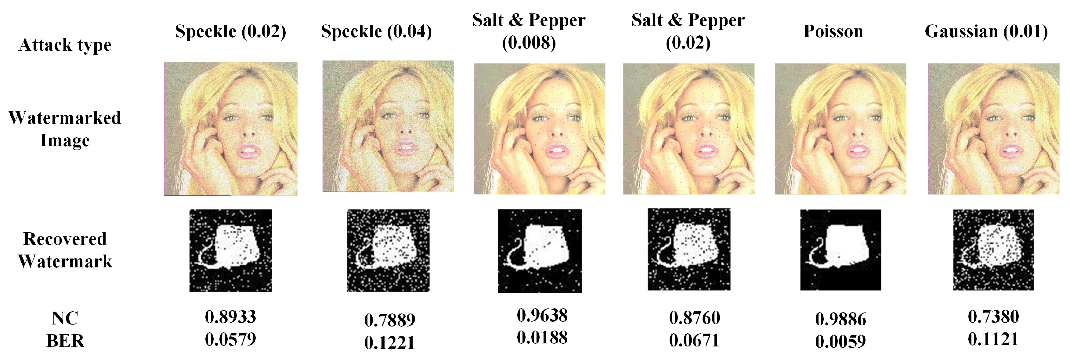 In this simulation, a variety of noises like speckle noise, pretzel noise, and Gaussian noise are added to the watermarked image. The NC results are listed in